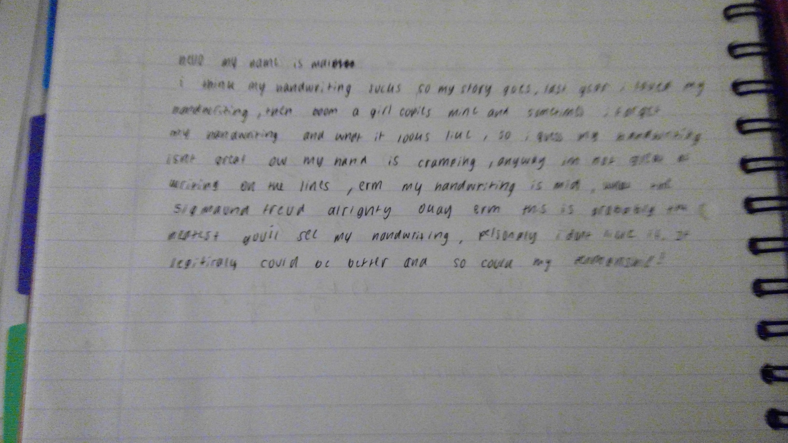 This handwriting reveals a self-aware and expressive individual who values spontaneity over perfection, but acknowledges the need for improvement. With focused practice, greater legibility and consistency can be achieved.