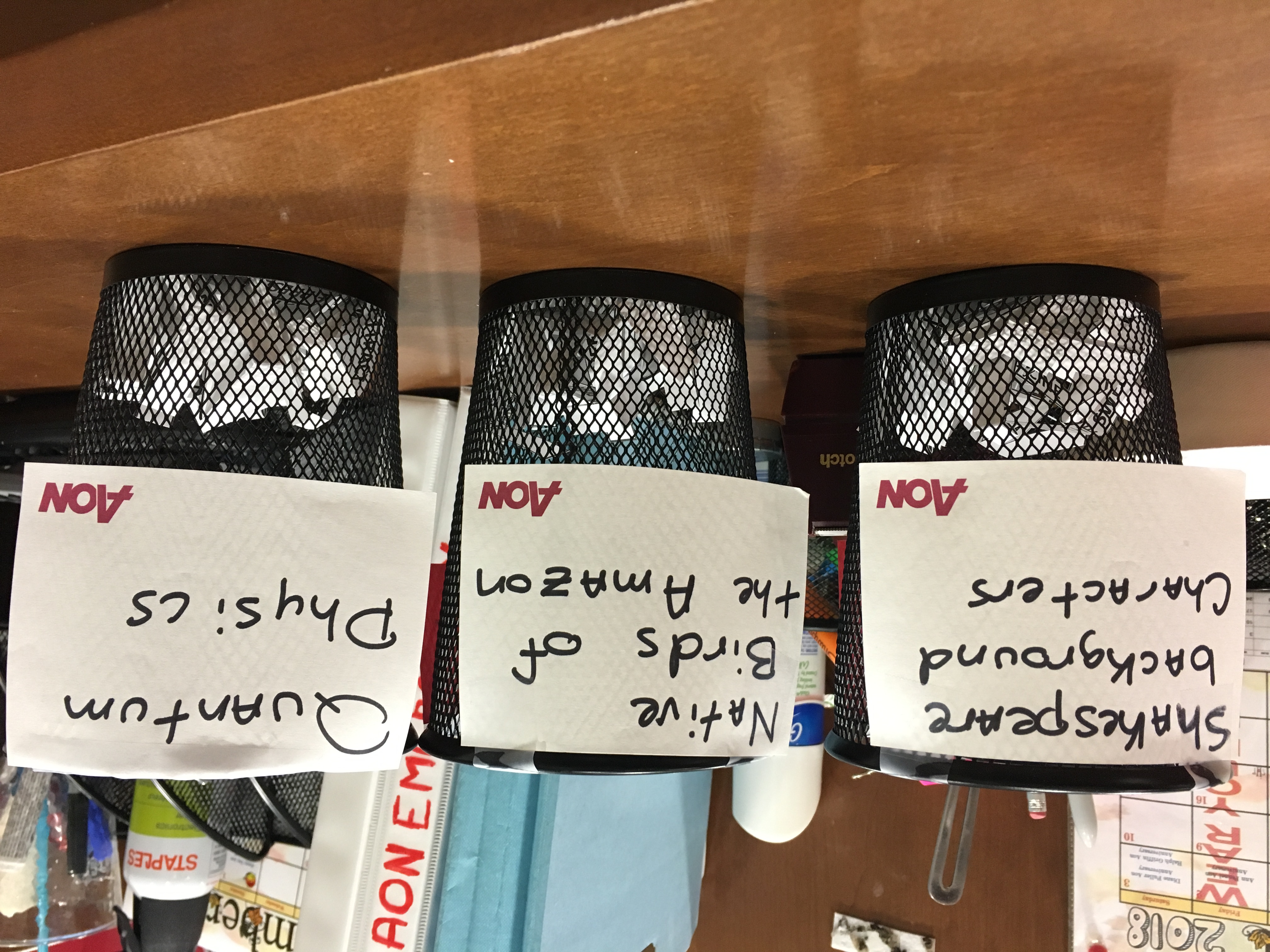 The handwriting exhibits a clear, upright style with rounded letter formations. The words "Quantum Physics", "Birds of the Amazon" and "Shakespeare background characters" demonstrate a deliberate, unhurried hand, where each letter is carefully crafted, resulting in high legibility. There is a slight backward slant in the writing, and the baseline follows a horizontal path. The spacing between words is consistent and adequate.