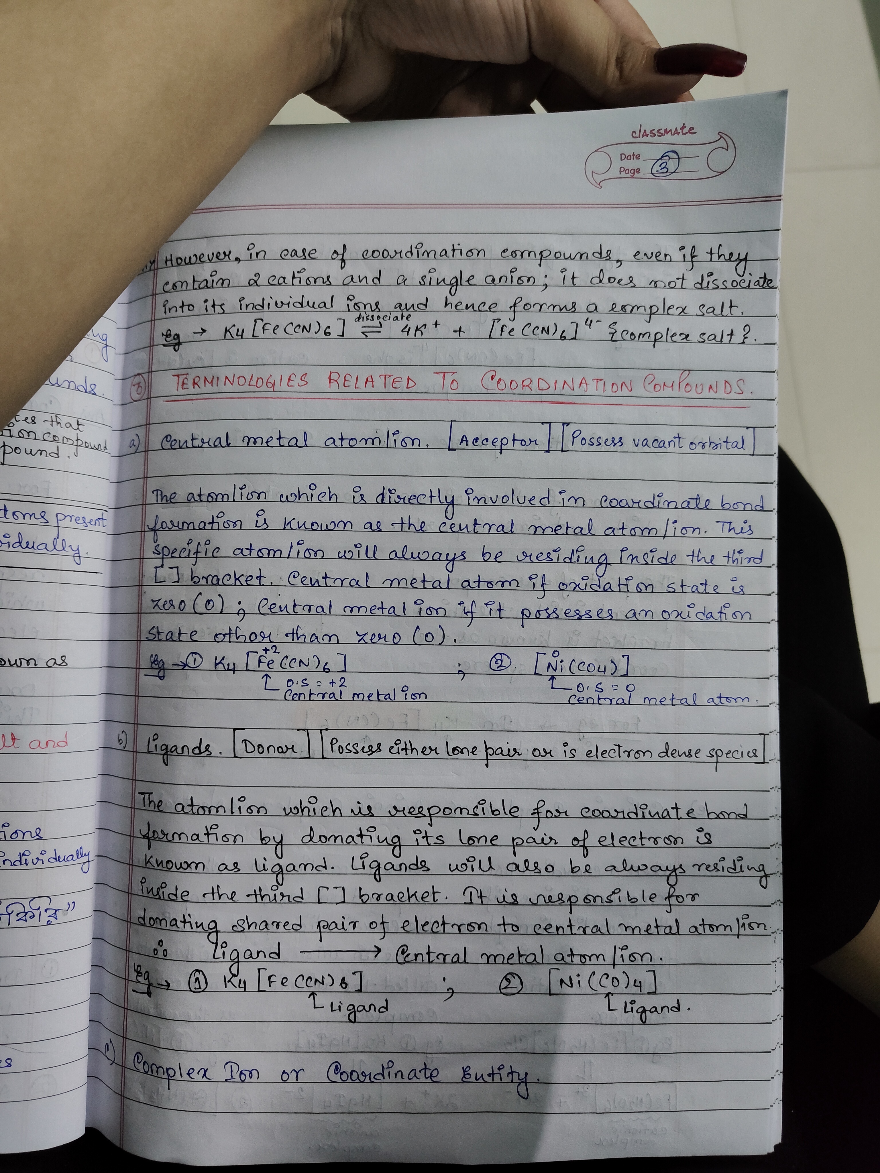 Your handwriting has a structured and neat appearance. The consistent spacing and uniform letter size, as seen in phrases like "Central metal atom/ion" and "Coordinate bond formation", suggest a methodical approach to writing. The generally upright slant and careful formation of letters indicate a desire for clarity and precision.