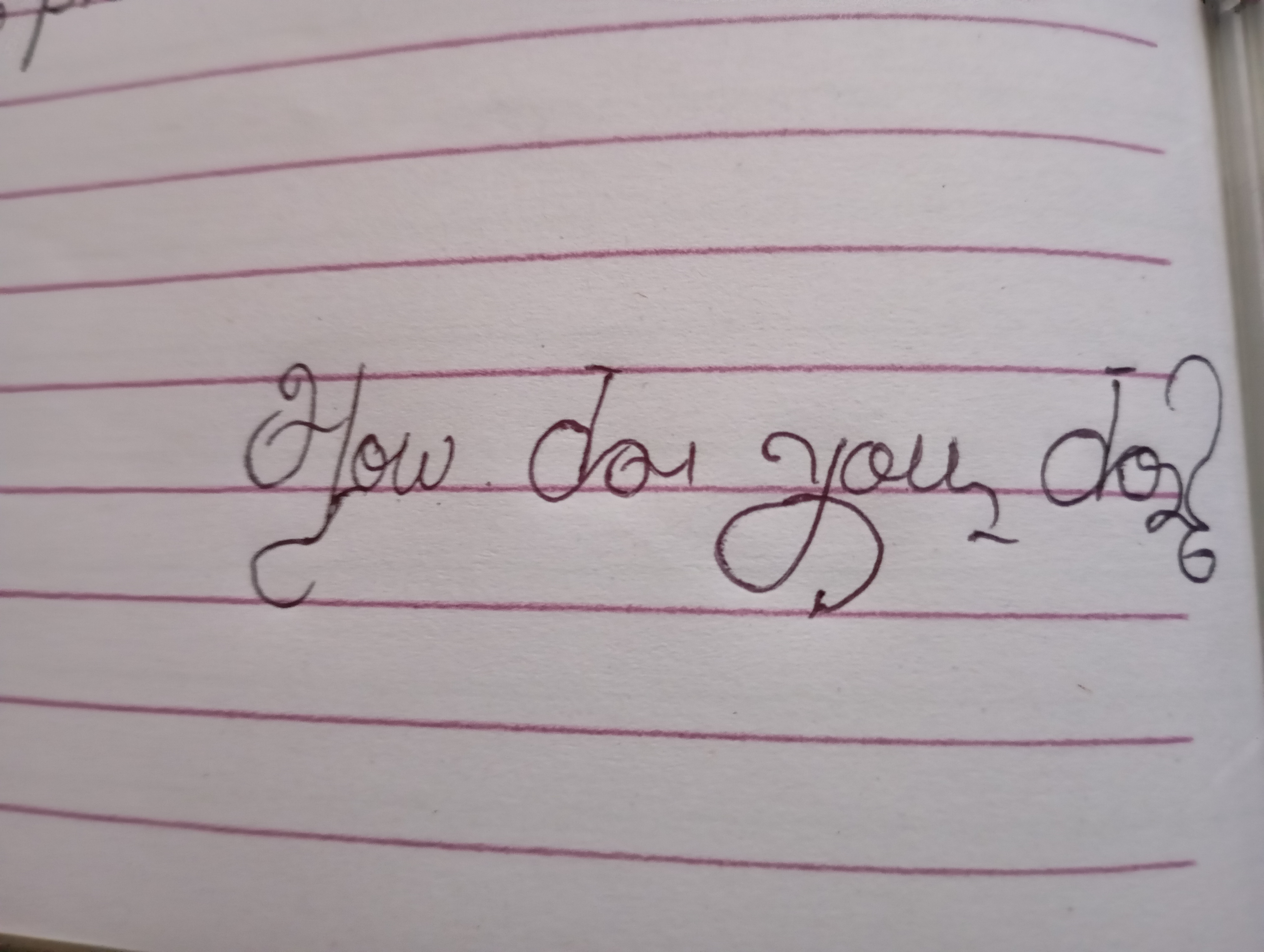 This handwriting is characterized by its generous use of curves and loops, as seen in the flourishes of the capital "H" in "How" and the roundness of the "o" and "d" throughout. There's a playful, almost whimsical quality to the way the letters connect and dance across the page. The pressure seems consistent, and the lines are smooth, indicating a fluid writing style. However, the slant is inconsistent and there is not a consistent baseline. Some letters appear cramped, like the tail of the "y" in "you".