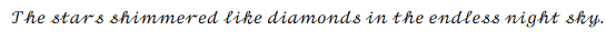 This handwriting exhibits a cursive style with a notable slant to the right. The letters are generally well-formed, as seen in words like "shimmered" and "diamonds," indicating a good level of control. The connecting strokes between letters are smooth, which suggests fluency. However, there's a slight inconsistency in letter size and spacing, which can be observed when comparing the 's' in "stars" and "shimmered." Overall, the writing appears neat and fairly legible.