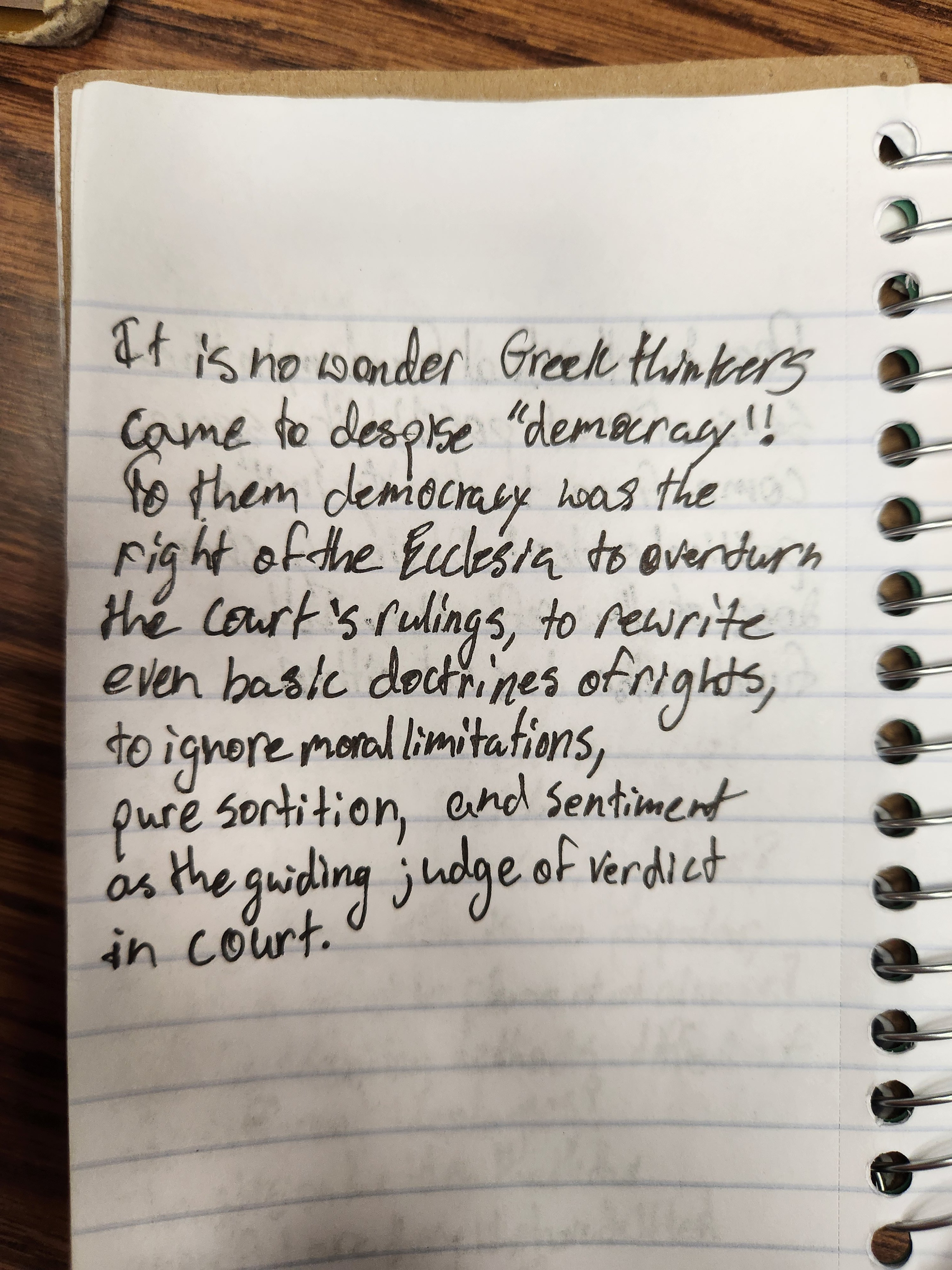 The handwriting is characterized by a noticeable slant to the right, indicating a degree of impulsivity and forward-thinking. The letter forms are rounded, with some angularity, such as in the sharp peaks of the 'm' in 'democracy' and the 'n' in 'wonder'. There is a sense of compactness, where words are closely spaced, suggesting a need to quickly convey ideas. The overall appearance leans towards a somewhat informal and unrefined style, yet the text is reasonably legible. The baseline is relatively consistent, with occasional dips, implying a balance of control and spontaneity.
