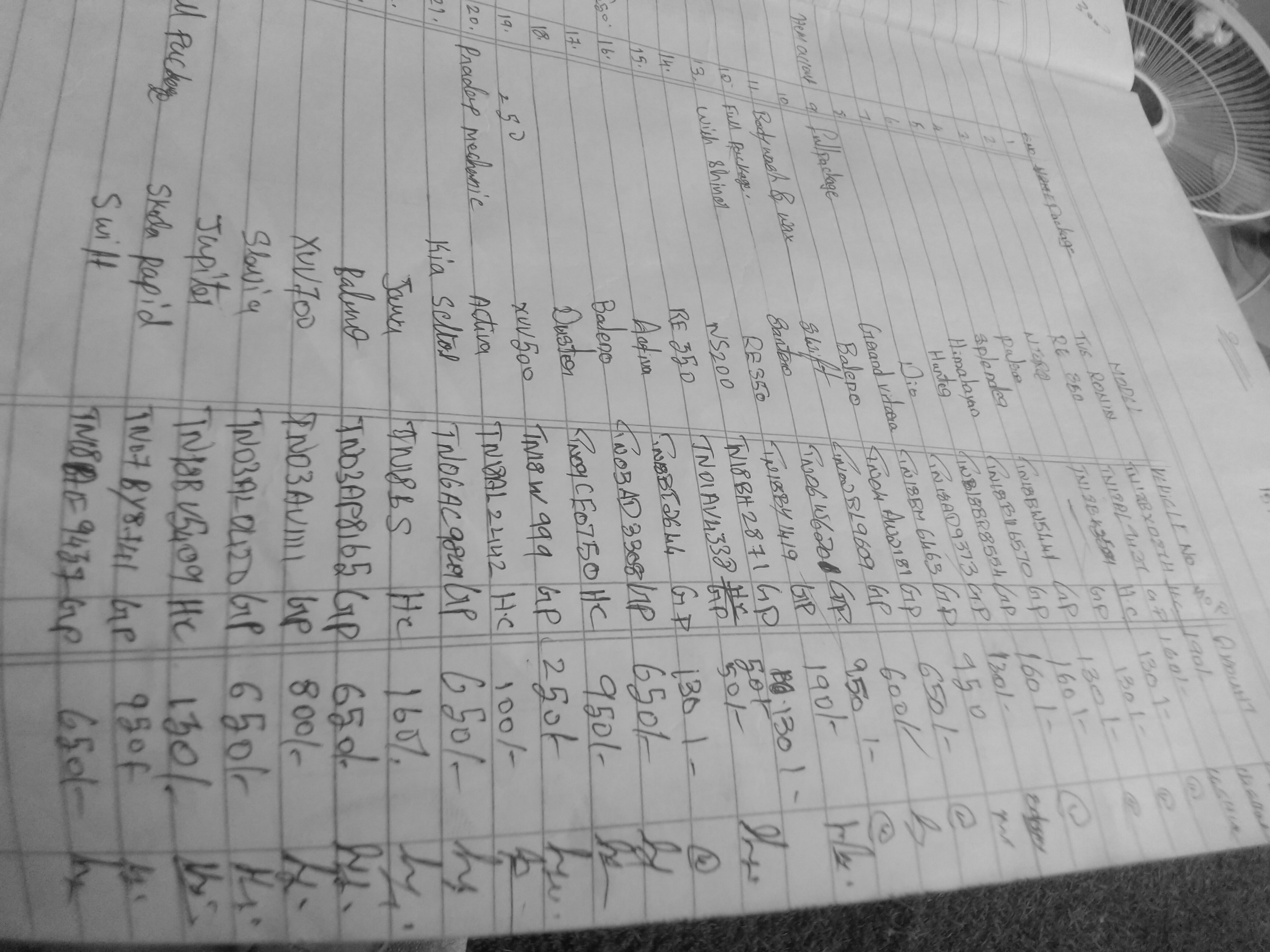 The handwriting in this sample presents a predominantly vertical slant, indicating objectivity and emotional reserve. The letters are generally well-formed, but there's a degree of irregularity in size and spacing. Notice the inconsistent sizing between words like "Baleno" and "Activa", as well as the variation in the letter height, especially within the long lists. Overall, the writing appears functional and efficient, prioritising legibility over artistic flair.