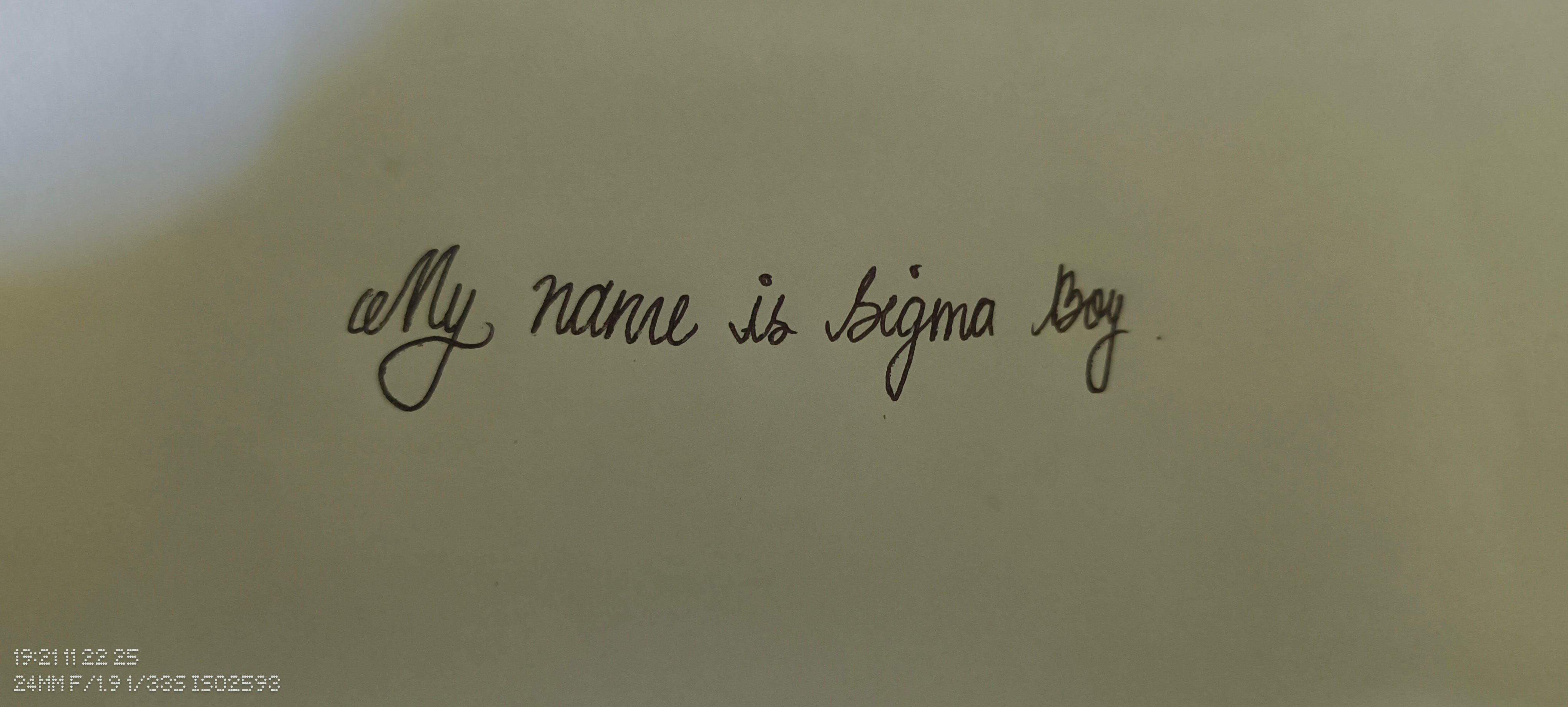 This handwriting exhibits a cursive style with notable loops and curves. The letter 'y' in 'My' has a pronounced loop, as does the 'b' in 'boy'. The script is somewhat inconsistent in slant and pressure, with some letters appearing darker and more emphasized than others. Overall, the handwriting is relatively legible, although some letters, such as the 'g' in 'sigma', could be clearer. The baseline wavers slightly, indicating a possible lack of strict control.