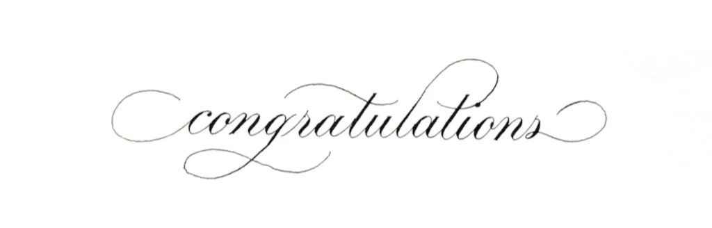 The handwriting is characterized by its elegant and flowing style. The letters are elongated and connected with graceful curves, creating a sense of fluidity and sophistication. The word 'congratulations' is written with precision, each letter carefully formed and spaced. The 'c' and 's' are particularly noteworthy, with their delicate swirls and loops. The overall impression is one of refinement and attention to detail.