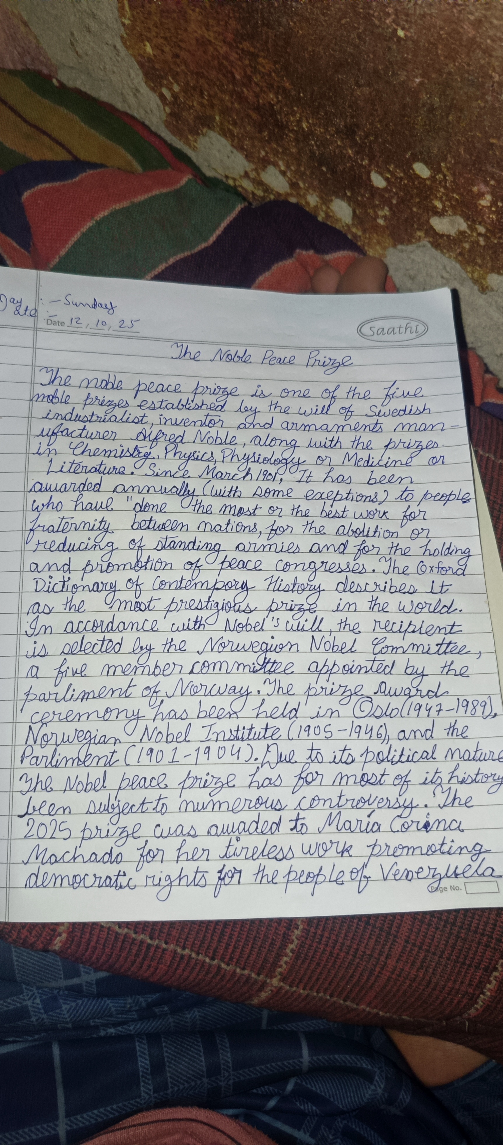 The handwriting is neat and carefully formed, with a slightly rounded quality. The script leans toward a rightward slant, suggesting a forward-moving and engaging personality. The writer exhibits consistency in letter size and spacing, which indicates discipline and attention to detail. Phrases such as "Noble Peace Prize", "established by the will", and "tireless work promoting" are rendered with clear and deliberate strokes.