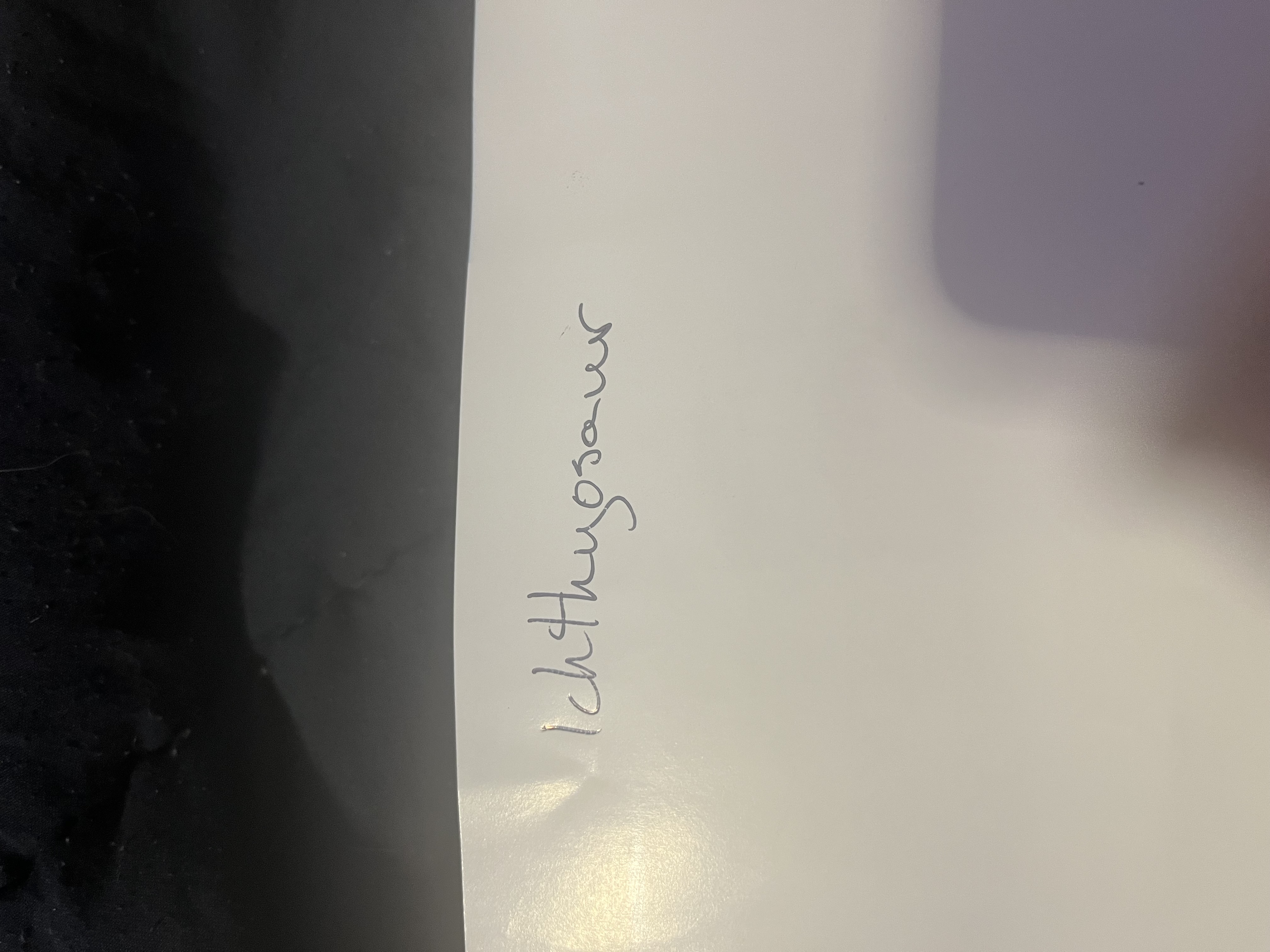 The handwriting style presents a somewhat connected, flowing script. The size is average, with a slight slant to the right. Letter formations, such as the 'I' and 't', show a simple, unfussy design, prioritizing function over flourish. The word 'Ichthyosaur' is generally legible, although some might find the 'y' a bit ambiguous. There's a moderate amount of pressure applied, resulting in fairly consistent line thickness throughout the word.