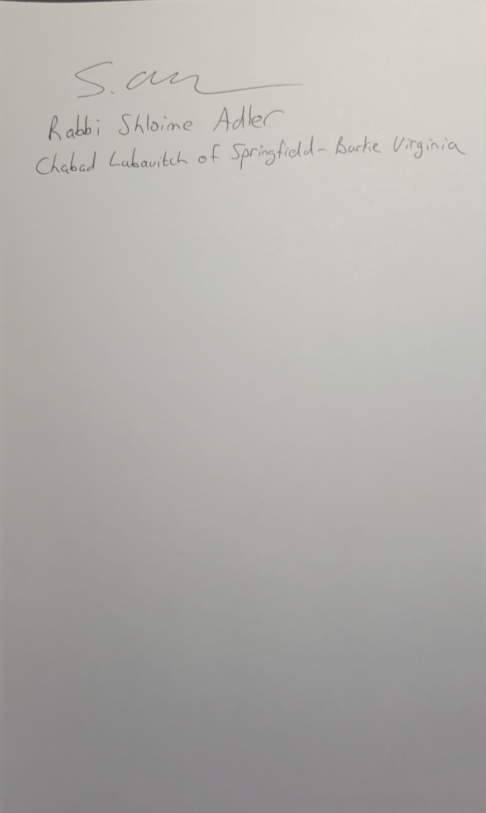 The handwriting style presented here exhibits a thoughtful, measured quality. The letters are generally well-formed and legible, with a slightly rounded appearance. The slant is minimal, suggesting a degree of objectivity. Notice the careful execution of each letter in 'Rabbi Shloime Adler' and the even spacing between words. The signature is abbreviated but clearly presented, and the text flows consistently from left to right. Overall, the handwriting conveys a sense of calm precision.