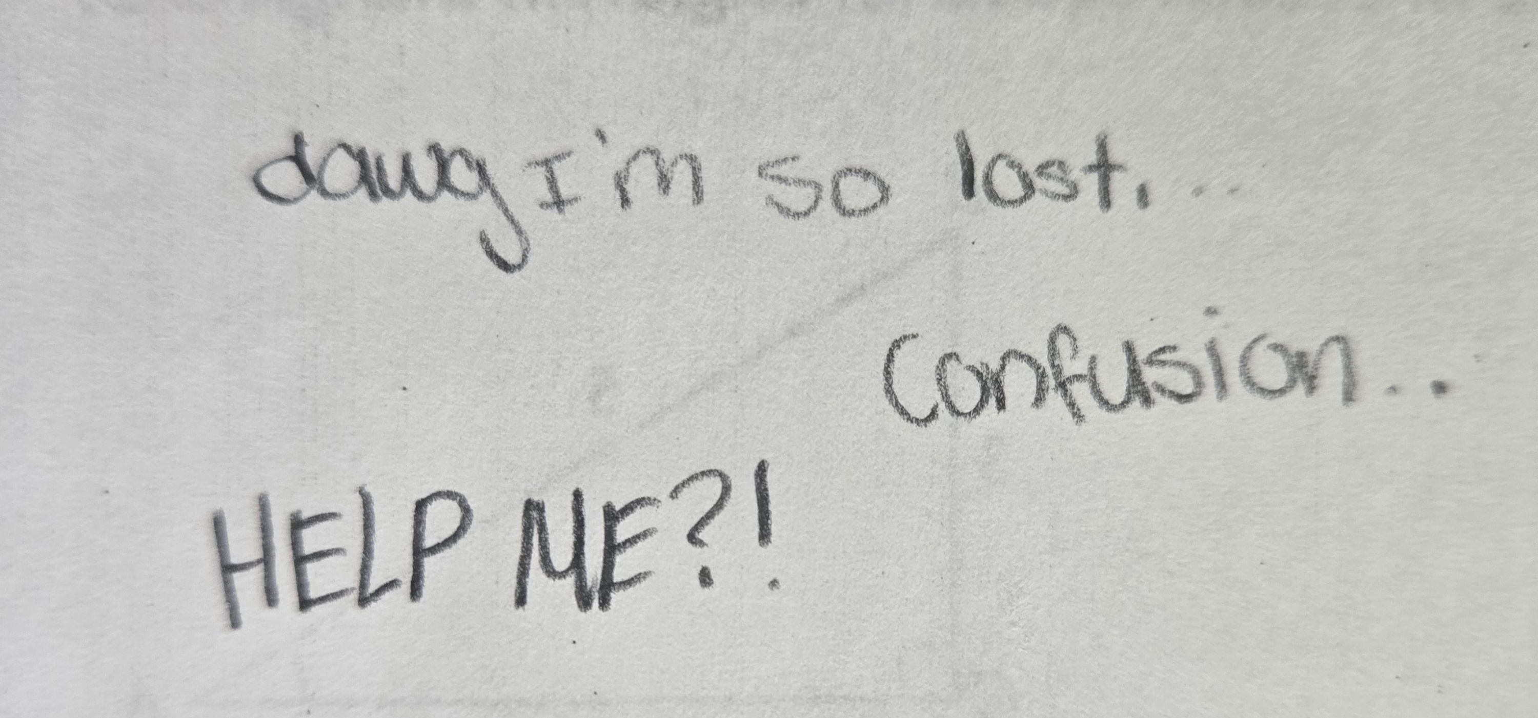Based on the handwriting, the writer may possess a personality that is prone to anxiety and easily overwhelmed. The plea for help suggests a dependency on others for support, and the "confusion" may indicate a tendency to overthink or struggle with decision-making. There might be a childlike innocence or naivety present, coexisting with moments of heightened emotional intensity.