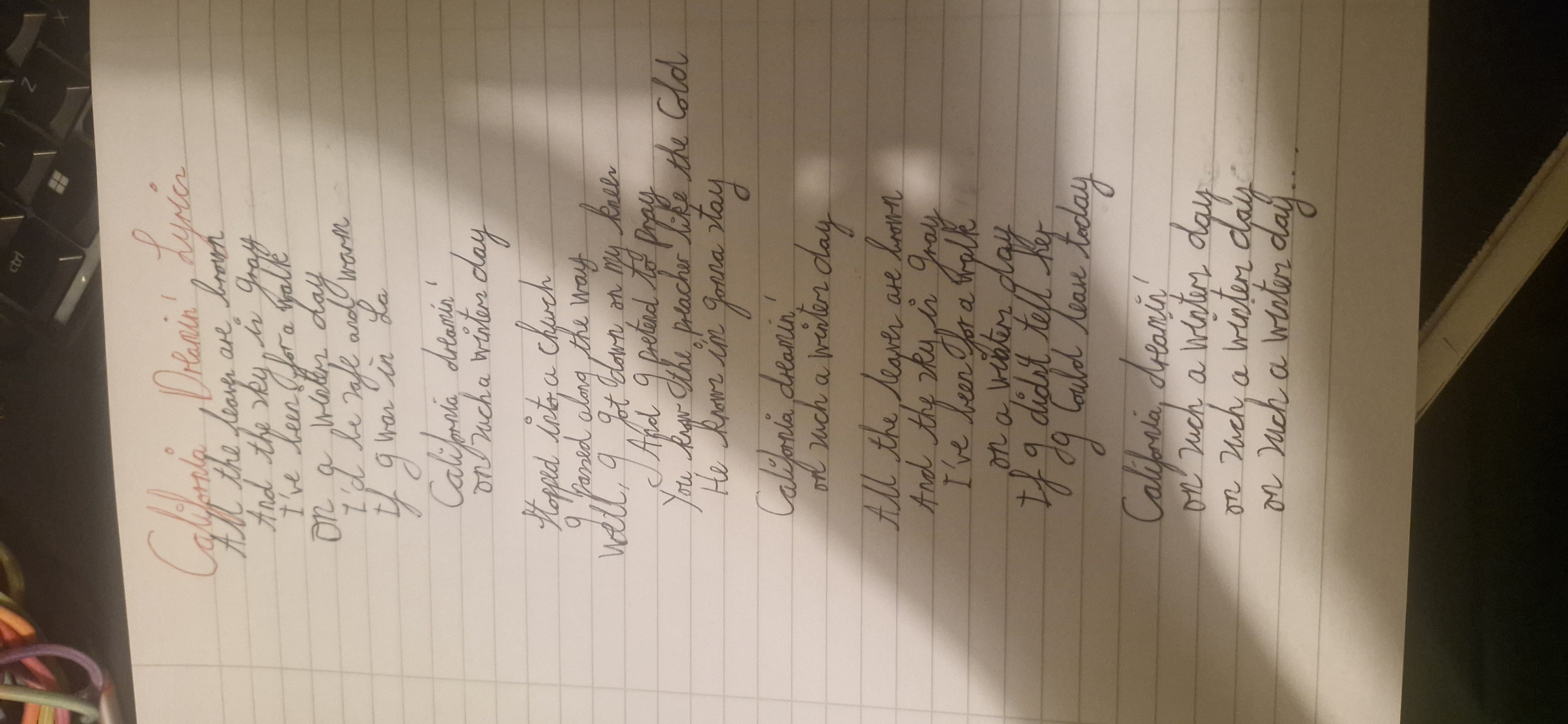 The handwriting leans towards a flowing, cursive style, evident in the connecting strokes between letters within words like "California dreamin'" and "winter day." There's a slight rightward slant, suggesting a degree of impulsivity. The letter sizes appear somewhat inconsistent, with some letters being taller than others, such as the capital letters versus the lowercase. Overall, the writing appears moderately legible, though some words are slightly cramped. The pressure seems relatively consistent, indicating a steady hand.