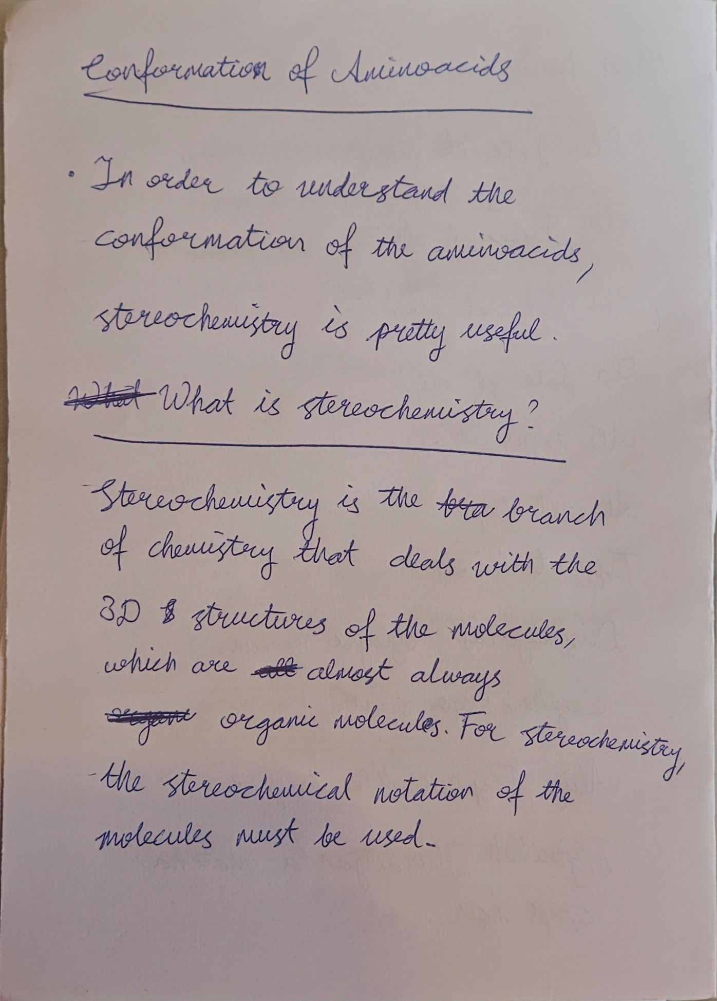 This handwriting exhibits a flowing, cursive style with notable loops and rounded letterforms, seen particularly in words like "conformation" and "stereochemistry." The baseline adherence is relatively consistent, suggesting good control. However, there are instances of crossed-out words, such as the repeated "What" and the word before "organic," indicating a degree of impulsiveness or editing during the writing process.