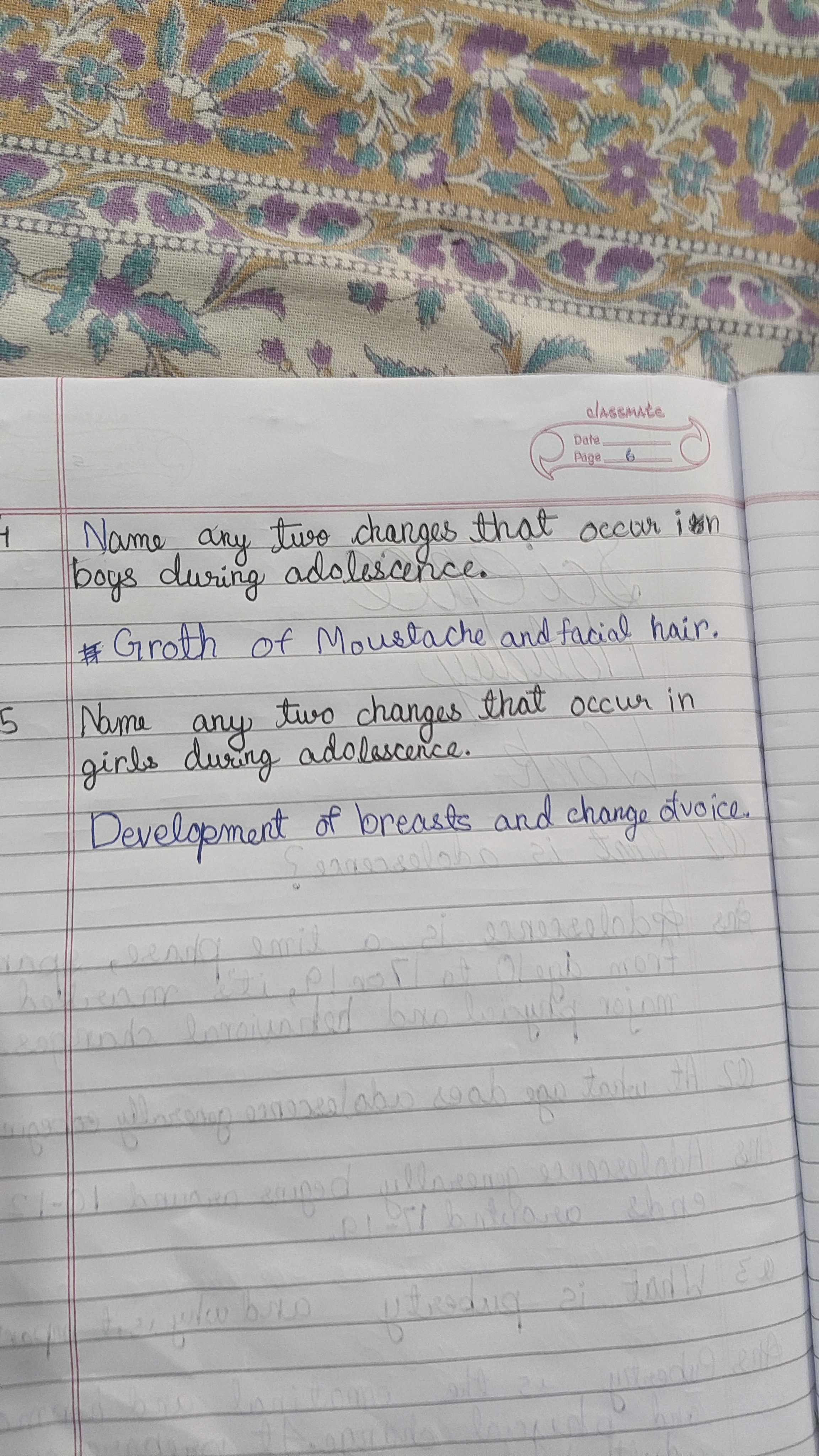The handwriting in this sample exhibits a generally neat and rounded style. The letter formations are clear, with distinct loops and curves, such as those seen in the words "Name", "adolescence" and "Development". There's a good degree of consistency in letter size and spacing, though some variation can be observed, suggesting a comfortable but not overly rigid approach to writing. The slant is fairly uniform and slightly to the right, indicating a natural and forward-leaning momentum. The use of cursive elements connects some letters within words, contributing to an overall sense of flow, although some letters, such as 'o' and 'a', can appear slightly closed.