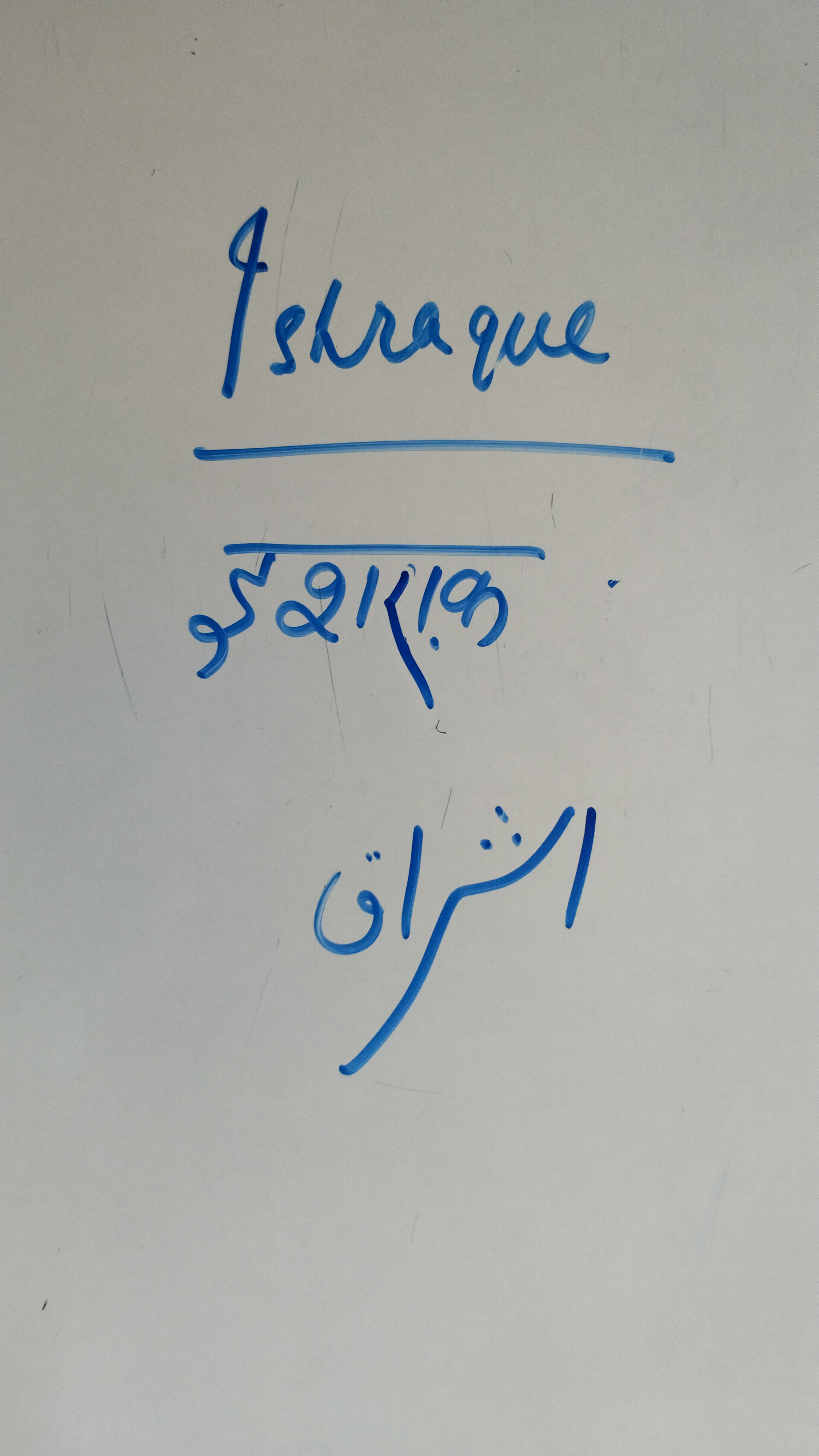 The handwriting style is characterized by its deliberate strokes and clear separation of letters. The script, though written with a marker, suggests a careful approach to forming each character, whether in English or the Arabic script. The 'I' in 'Ishraque' has a distinct flourish, while the letters maintain a consistent size and spacing. There's an overall neatness that indicates attention to detail.