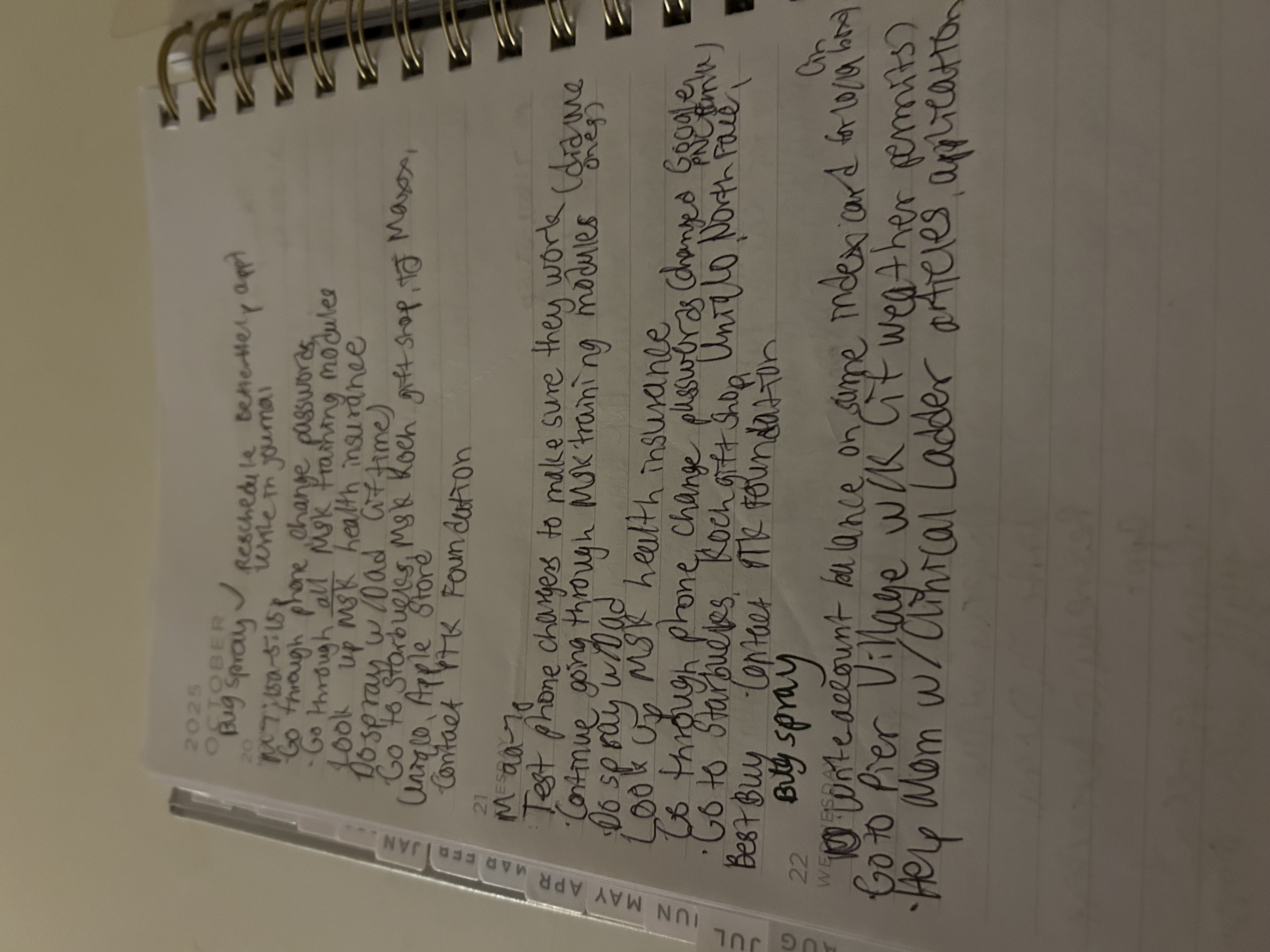 The handwriting sample reveals a practical and efficient style. The script is upright with a slight slant, suggesting a direct and straightforward approach. The letter formations are generally simplified, prioritizing speed and clarity over elaborate flourishes. The use of abbreviations like "w/" and shorthand notations is common. The size is consistent but somewhat cramped, indicating a focus on fitting information into a limited space, like a planner or notebook. Fluency is moderate; there are instances where the pen lifts between letters, but the overall flow remains relatively smooth. There's a sense of neatness, with lines generally followed, although the overall appearance is functional rather than aesthetically pleasing.