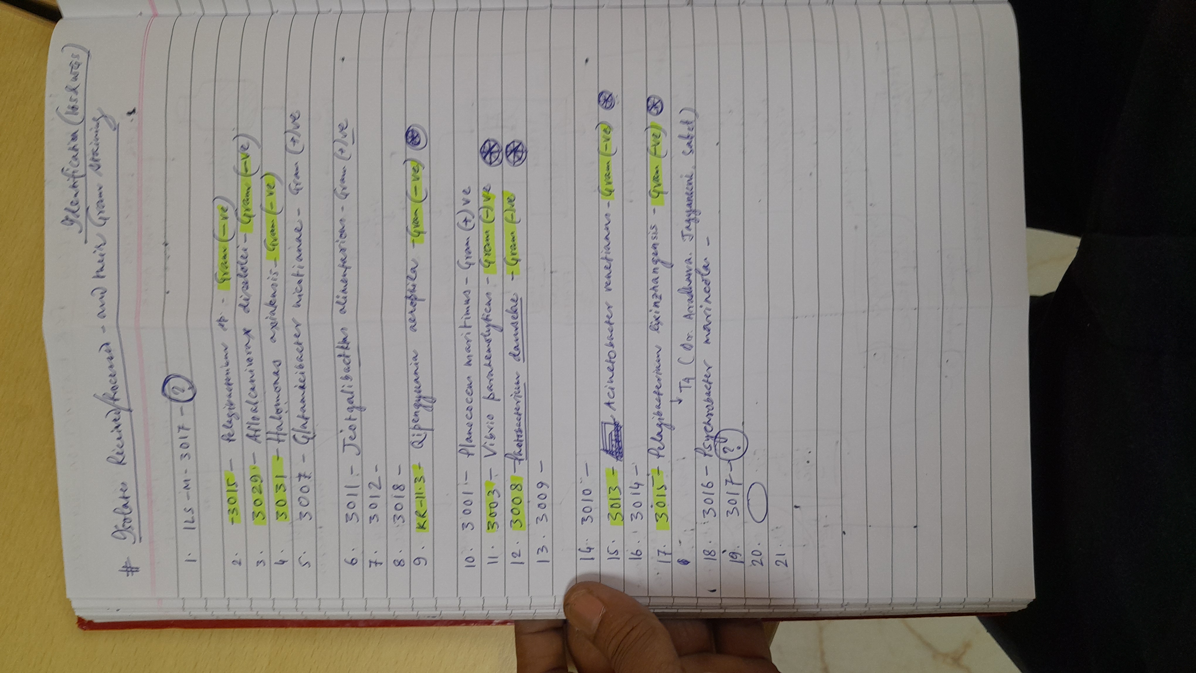 The handwriting exhibits a practical and functional style, clearly intended for note-taking and documentation. The letter forms are generally legible, with a slight forward slant suggesting a sense of purpose and efficiency. The writing is somewhat inconsistent, with variations in letter size and spacing, as seen in the differences between 'Identification' and 'Gram staining'. The use of abbreviations and numerical lists indicates a structured and organized approach to recording information.