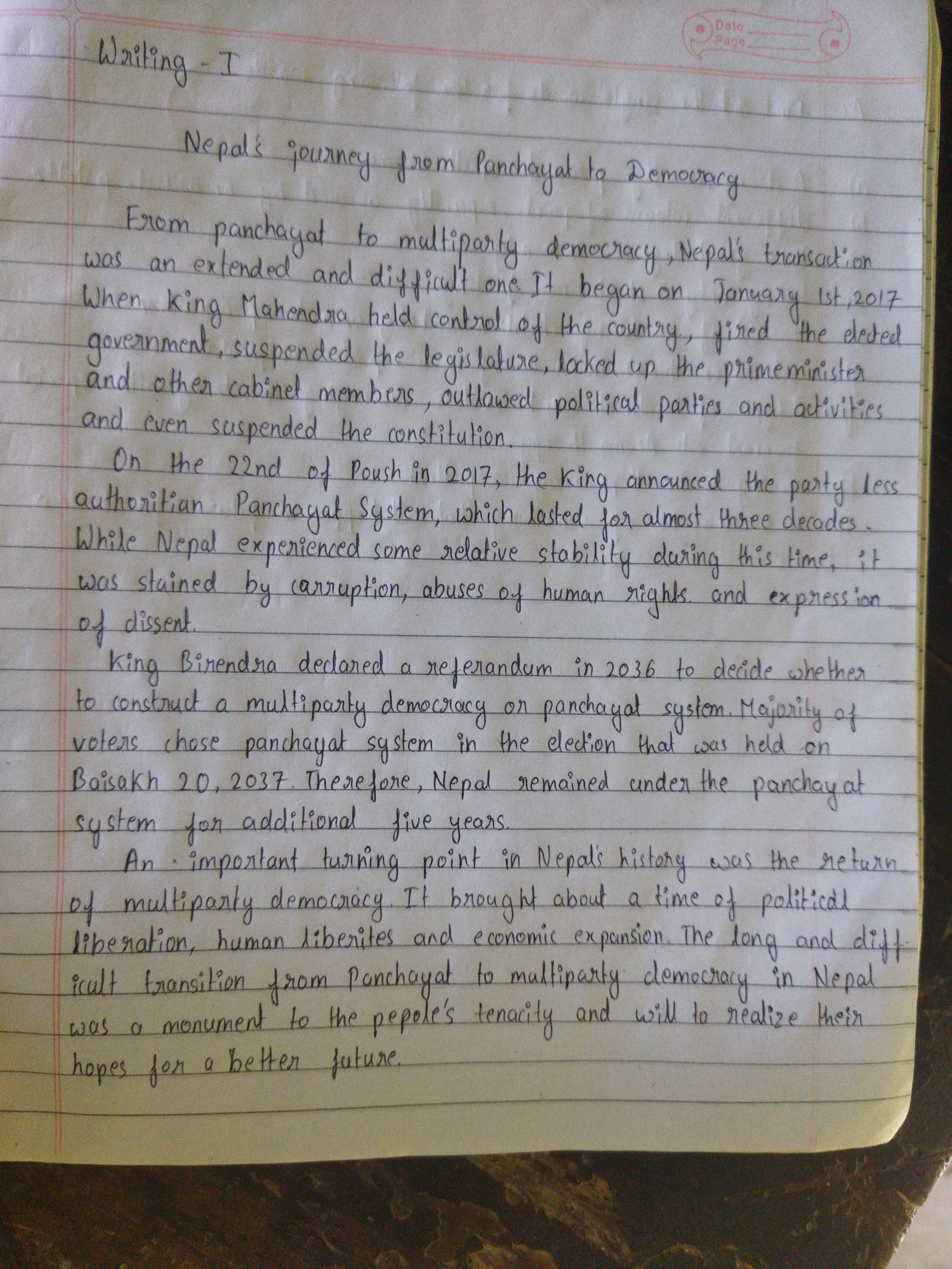 The handwriting presents a rounded, connected style, with a consistent slant that leans slightly to the right. Words like "Democracy" and "transaction" show a certain elegance in their formation, while the looping 'y's and 'g's indicate a degree of flair. The overall impression is neat and generally legible, although some letter formations could be more distinct, such as the 'r' in "referandum".