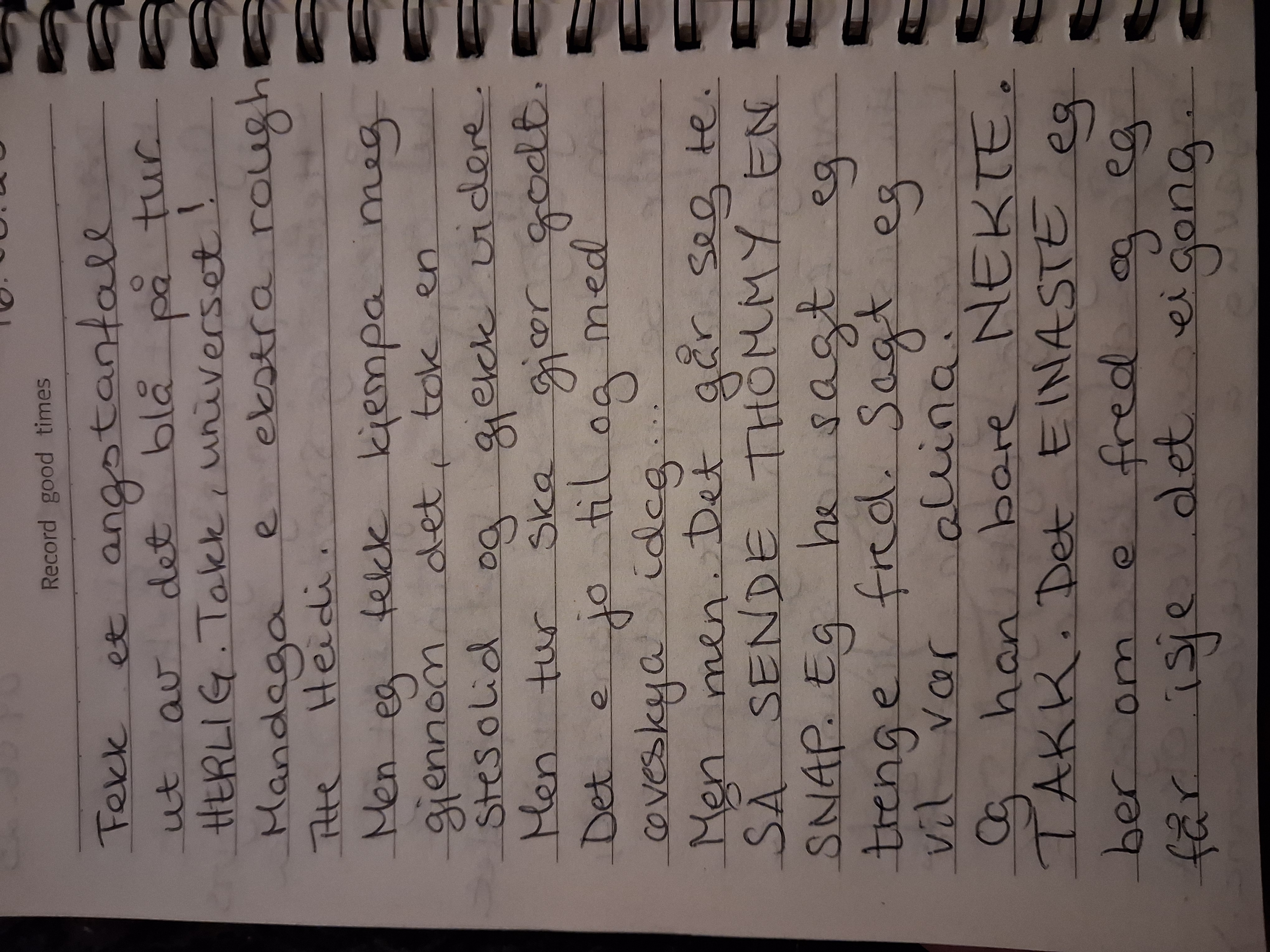 This handwriting style suggests a person who values clarity and directness, with a hint of creative flair. The mix of rounded and angular forms indicates adaptability and a balanced approach to life's challenges. The moderate letter spacing suggests a person who appreciates personal space and time for reflection. The variations in slant reveal a capacity for spontaneity and emotional expression. The writing exhibits a balance between logic and feeling. The strong capital letters such as 'TAKK' may imply assertiveness.