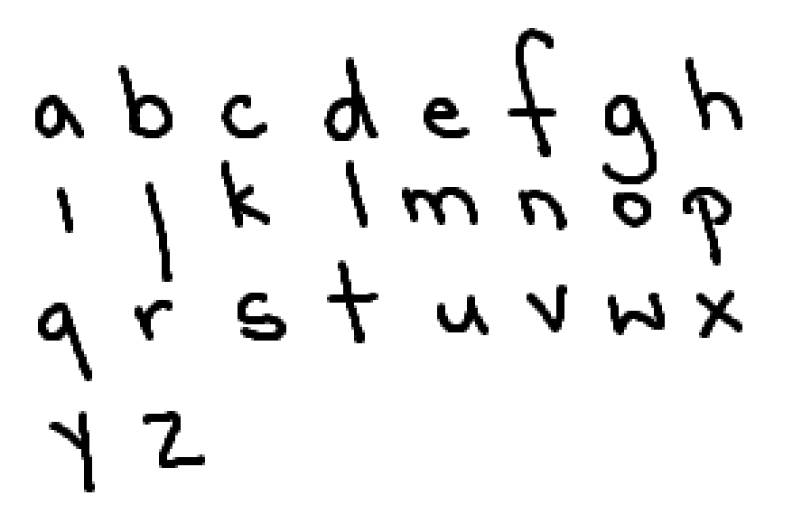 This handwriting style is characterized by rounded letterforms, seen especially in letters like 'a', 'o', and 'g'. The strokes are simple and direct, lacking in elaborate flourishes. There's a generally upright slant to the letters, with a few exceptions. The writing appears somewhat childlike, with uneven baselines and variations in letter size. The 'f' has a slightly exaggerated descender, while the 'k' and 'l' have a rather vertical stance.