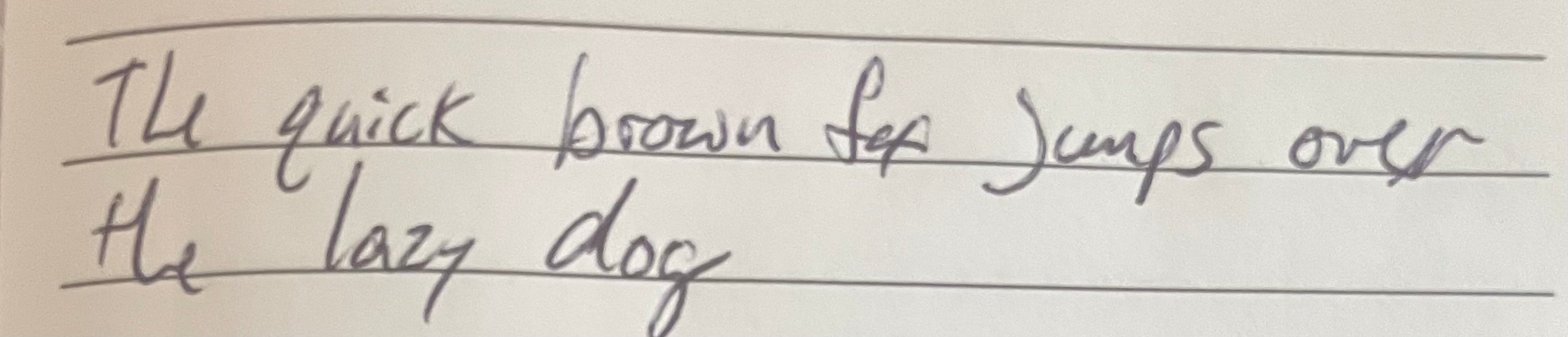 The handwriting presents a mix of cursive and print styles, exhibiting a forward slant and moderate letter spacing. Some letters, such as the 'T' in 'The' and 'J' in 'Jumps', have a tall upper extension, while others, like the 'g' in 'dog', have a looping lower extension. The baseline adherence is good, maintaining a relatively straight line. The writing is mostly legible, though some letters are formed quickly, impacting clarity.