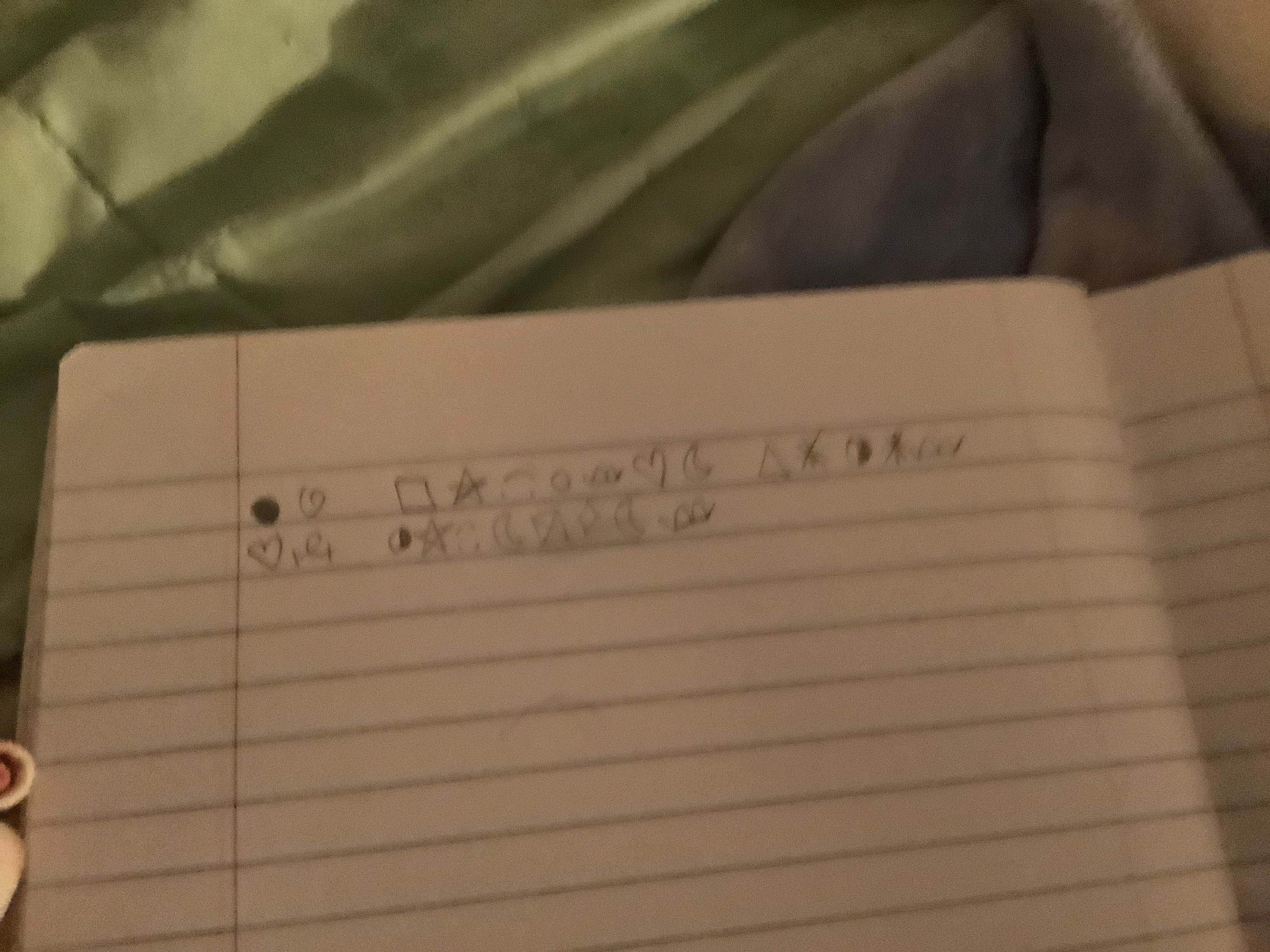 Based on this handwriting, one might assume the writer is imaginative, perhaps with a keen interest in cryptography, science fiction, or fantasy. They likely enjoy creating their own worlds and systems, possibly expressing a desire to communicate in a way that's uniquely their own. There may also be a touch of eccentricity and a willingness to stand out from the crowd, choosing personal expression over conventional norms.