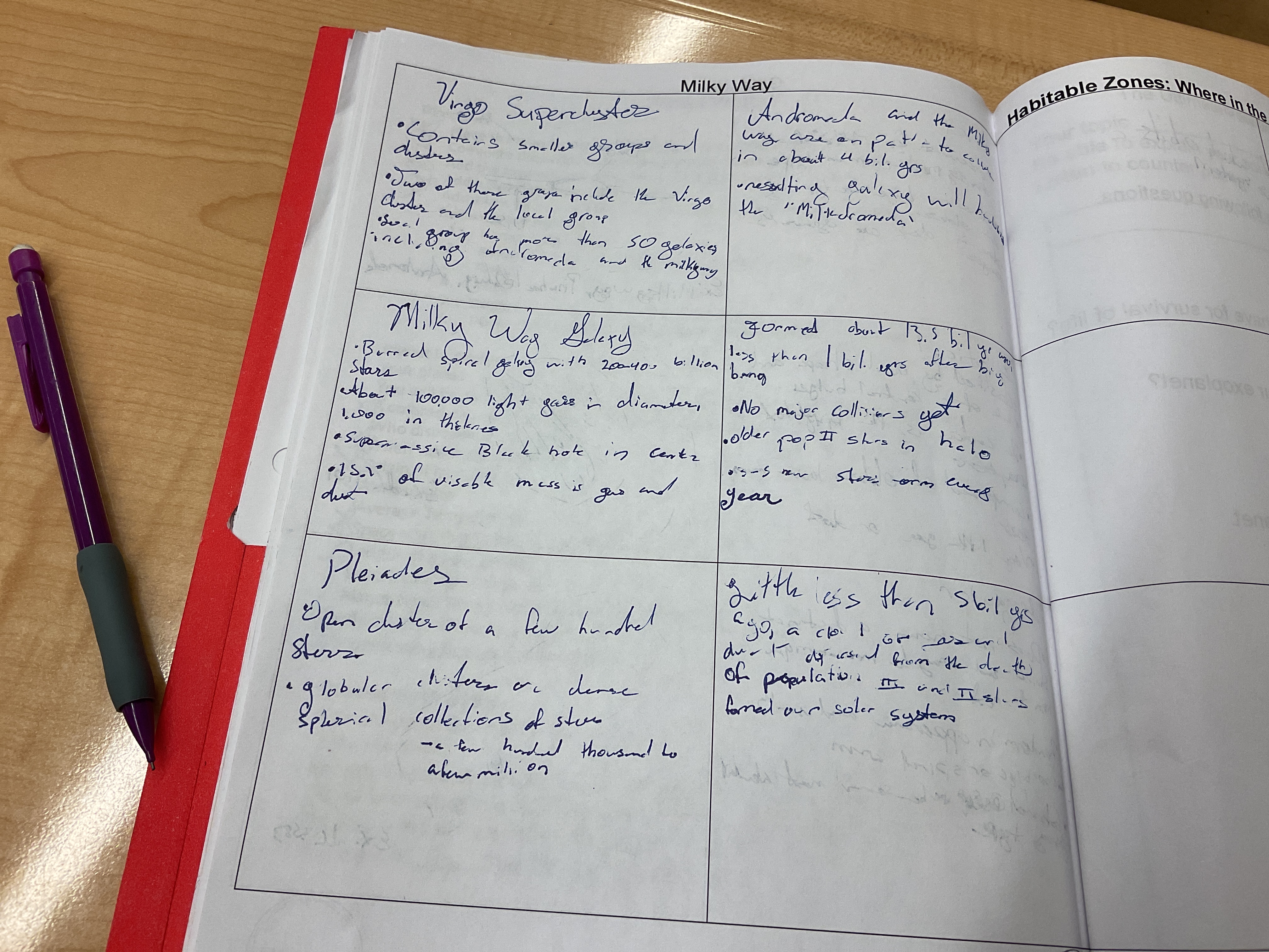 This handwriting gives the impression of someone rapidly jotting down notes during an engaging lecture or perhaps while stargazing on a brisk evening. The strokes are generally light and lack heavy pressure, and the handwriting leans to the right. Words are closely spaced together, with a sense of urgency permeating the text. Some letters, such as the lowercase 'g' and 'y', have extended loops, while others are formed with quick, efficient strokes.