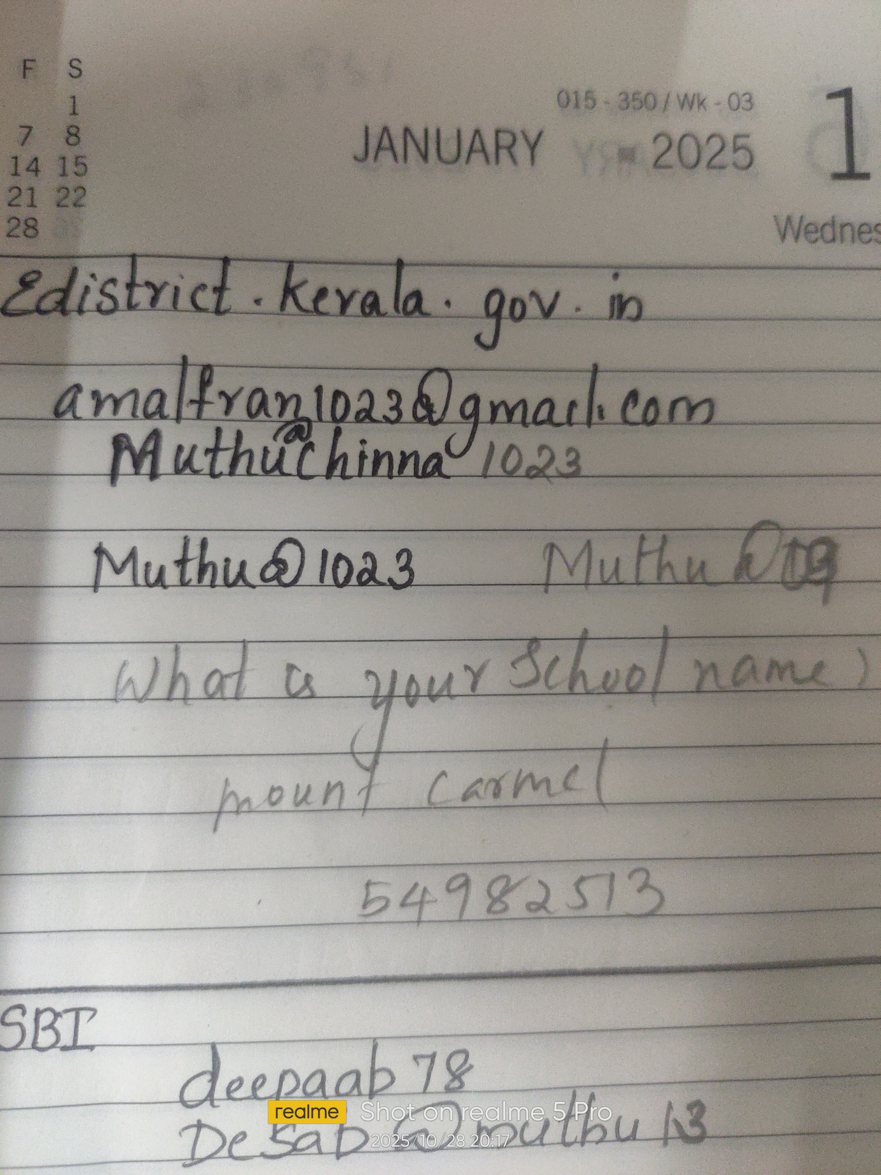 The handwriting sample presents a blend of cursive and print styles, leaning towards a functional and practical aesthetic. The writing exhibits a slightly irregular slant and a moderate degree of pressure. Letter formations are generally simple and legible, though there are variations in size and spacing. Words like "Edistrict", "Kerala", and "gmail" showcase a tendency to connect letters, while numbers such as "54982513" are distinctly printed. The overall impression is one of deliberate, but not overly stylized, handwriting.