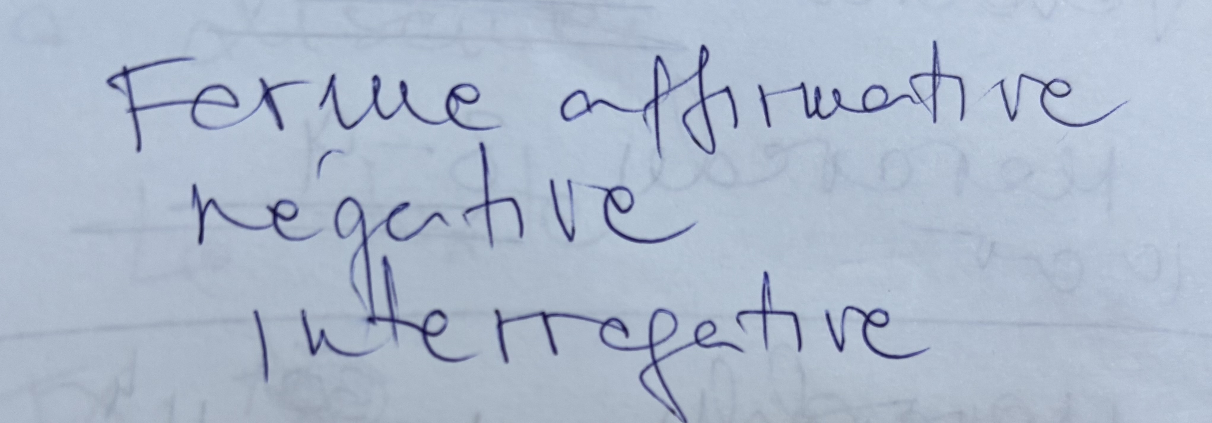 This handwriting leans towards a flowing, cursive style, evident in the connections between letters. The rounded forms of letters like 'e' and 'a' suggest a relaxed approach. However, the variable letter sizes and inconsistent baseline suggest a lack of strict adherence to rules. Some letters, such as the 't' in 'affirmative' and 'interrogative', have tall ascenders, while others are shorter, showing a playful disregard for uniformity.