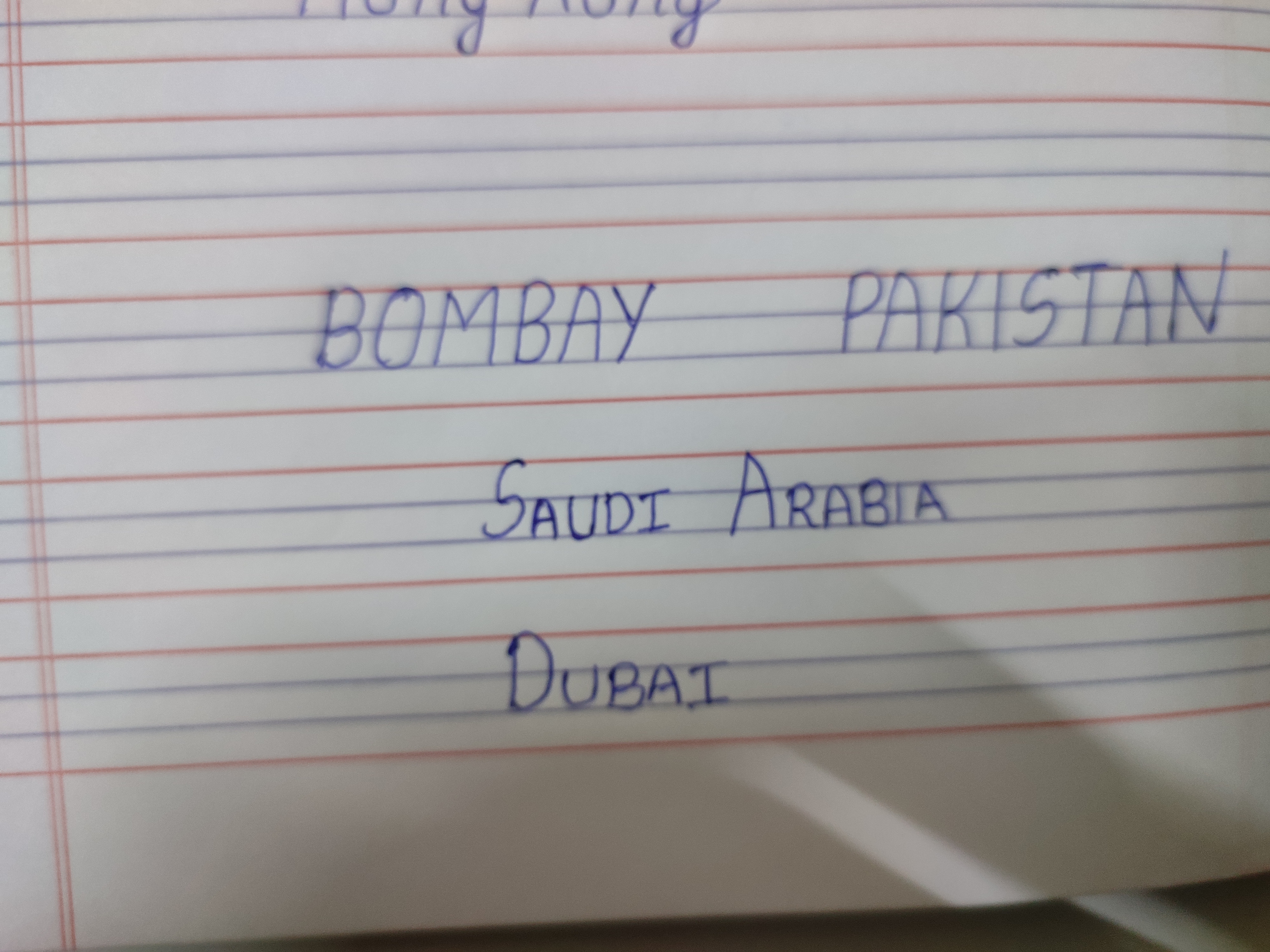 The handwriting exhibits a print-like style with individual letters formed distinctly, showing a clear separation between each character, as seen in "BOMBAY" and "PAKISTAN". The writing maintains a relatively uniform baseline, adhering closely to the lines of the paper. The size of the letters is consistent, although there's a slight variation in pressure, giving some characters a bolder appearance than others. The letter forms are simple and conventional, favoring rounded shapes, especially noticeable in letters like "O" and "D".
