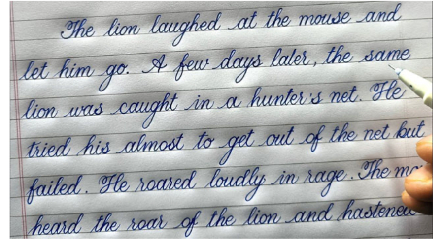 The handwriting presents a consistently looping cursive style. The connections between letters are fluid and generous, creating a sense of movement across the page, seen in phrases like "lion laughed" and "few days later". The letter heights are fairly uniform, and the baseline adherence is consistent, which contributes to the overall neatness. The writing exhibits a moderate slant, leaning slightly to the right, and the pressure appears even throughout.