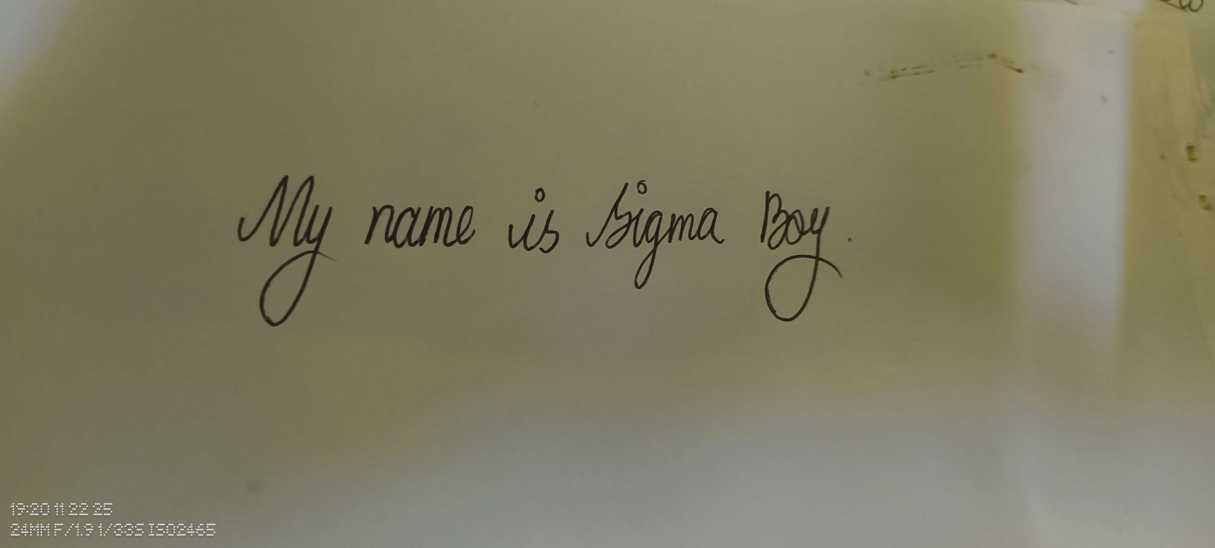 The handwriting style presented is characterized by elegant loops and curves, particularly noticeable in the capital letters 'M', 'S', and 'B' of 'My', 'Sigma', and 'Boy'. The baseline appears relatively stable, and the letter size is consistent, creating a harmonious visual rhythm. The connecting strokes between letters show a sense of fluidity, although there's a slight variability in the pressure applied, giving a light and airy feel to the writing. The dot over the 'i' in 'is' is a simple circle.