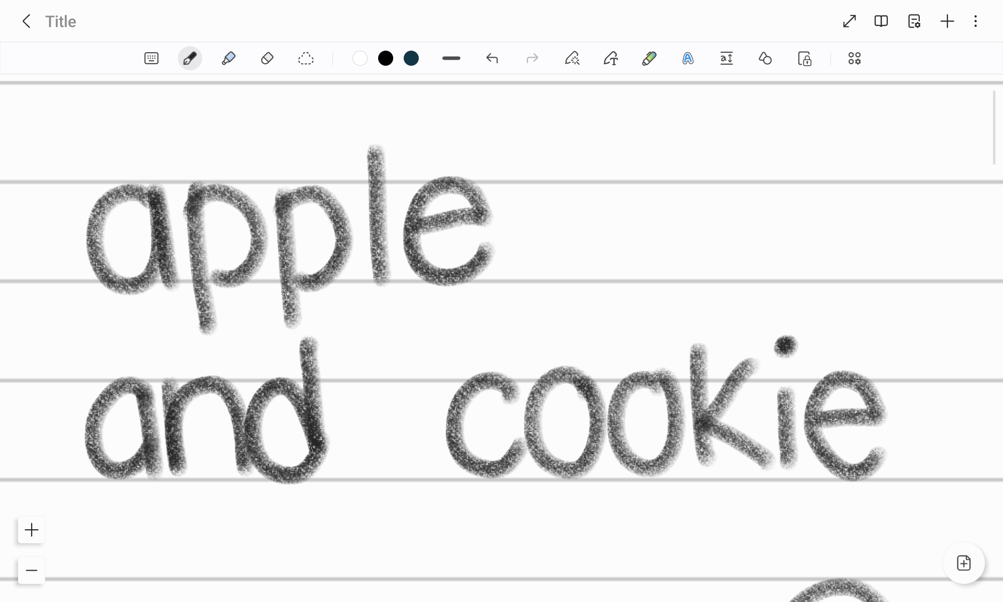 The handwriting style is large and rounded, reminiscent of block letters but with a cursive flow. The letters are spaced generously, giving an open and airy feel to the writing. Words like "apple" and "cookie" have a playful, almost childlike quality due to the roundedness and size. The thick strokes of the letters give the impression of someone writing deliberately and with emphasis.