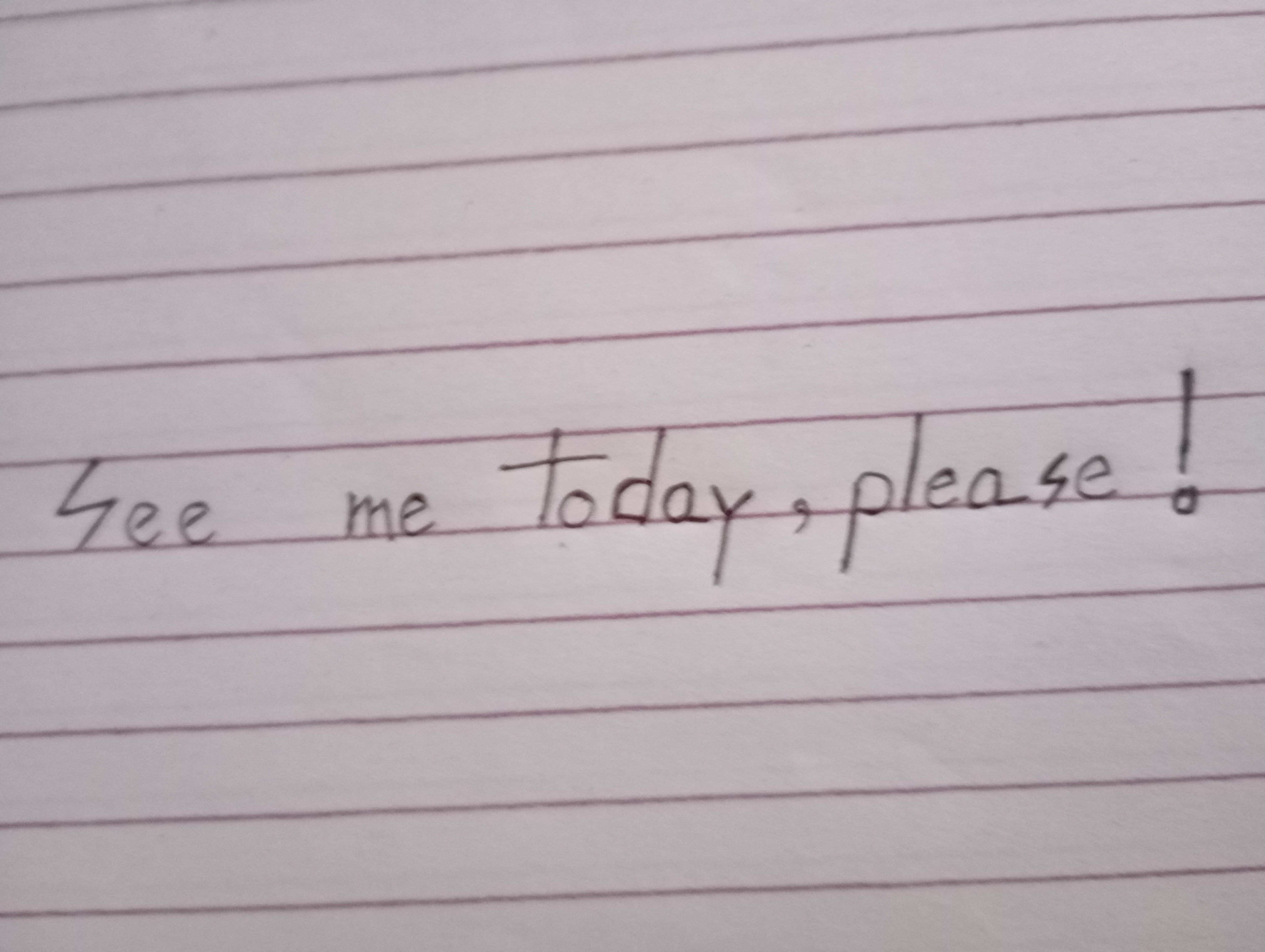 The handwriting is characterized by a simple, clear style. The letters are well-formed, though slightly angular. The size is moderate and the spacing between words is generally consistent. The writing sits squarely on the page lines. There is an economy of stroke; it is direct and to the point, as illustrated by the imperative "See me today, please!"