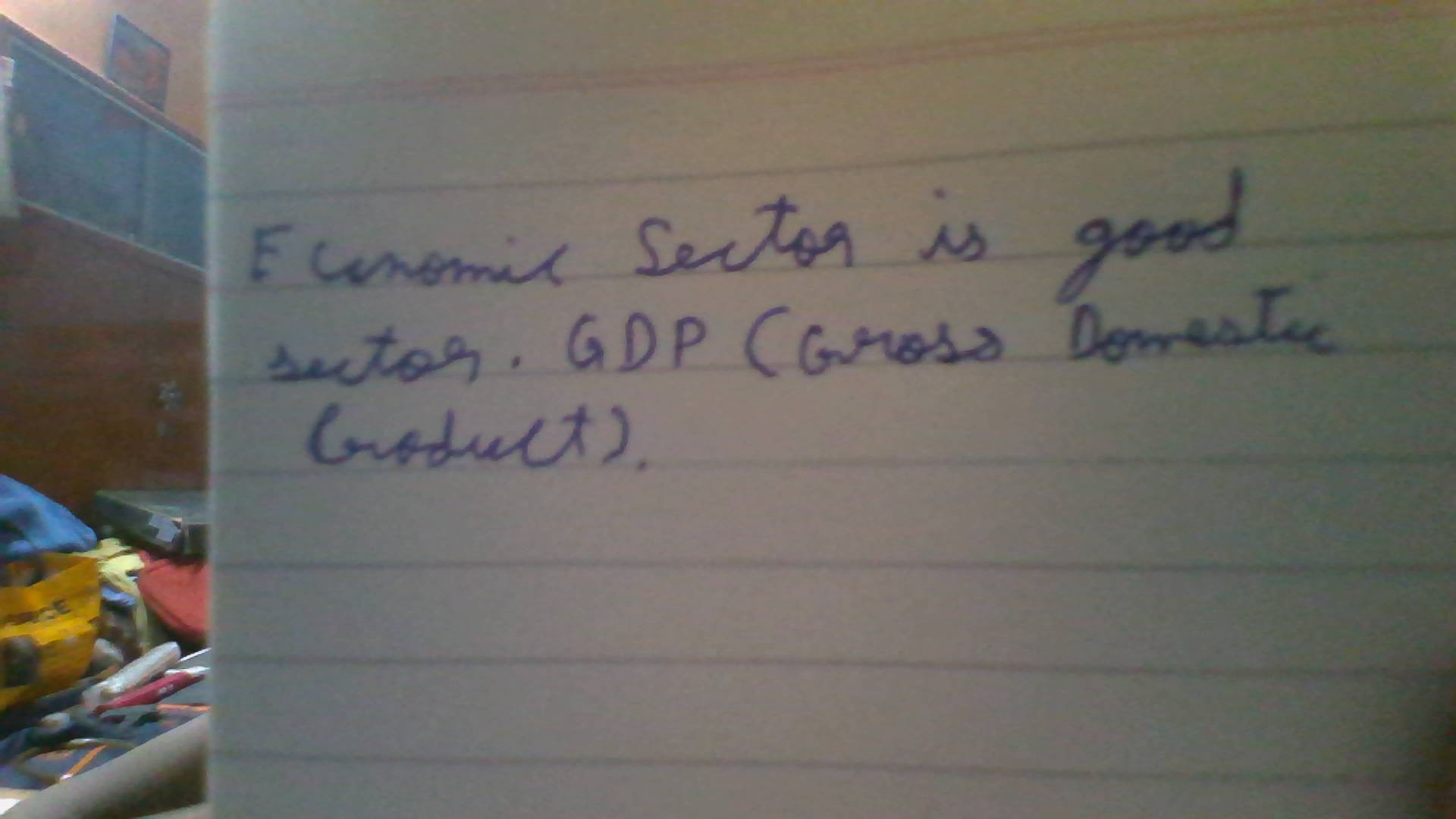 The handwriting exhibits a rounded and somewhat loopy style, particularly noticeable in letters like 'g' in 'good' and 'GDP', and 's' in 'sector'. There's a slight rightward slant, suggesting a forward-moving energy. The letter size is relatively consistent, though there's some variability in the spacing between words. Overall, the handwriting has a relaxed and flowing quality, though the consistency could be improved.