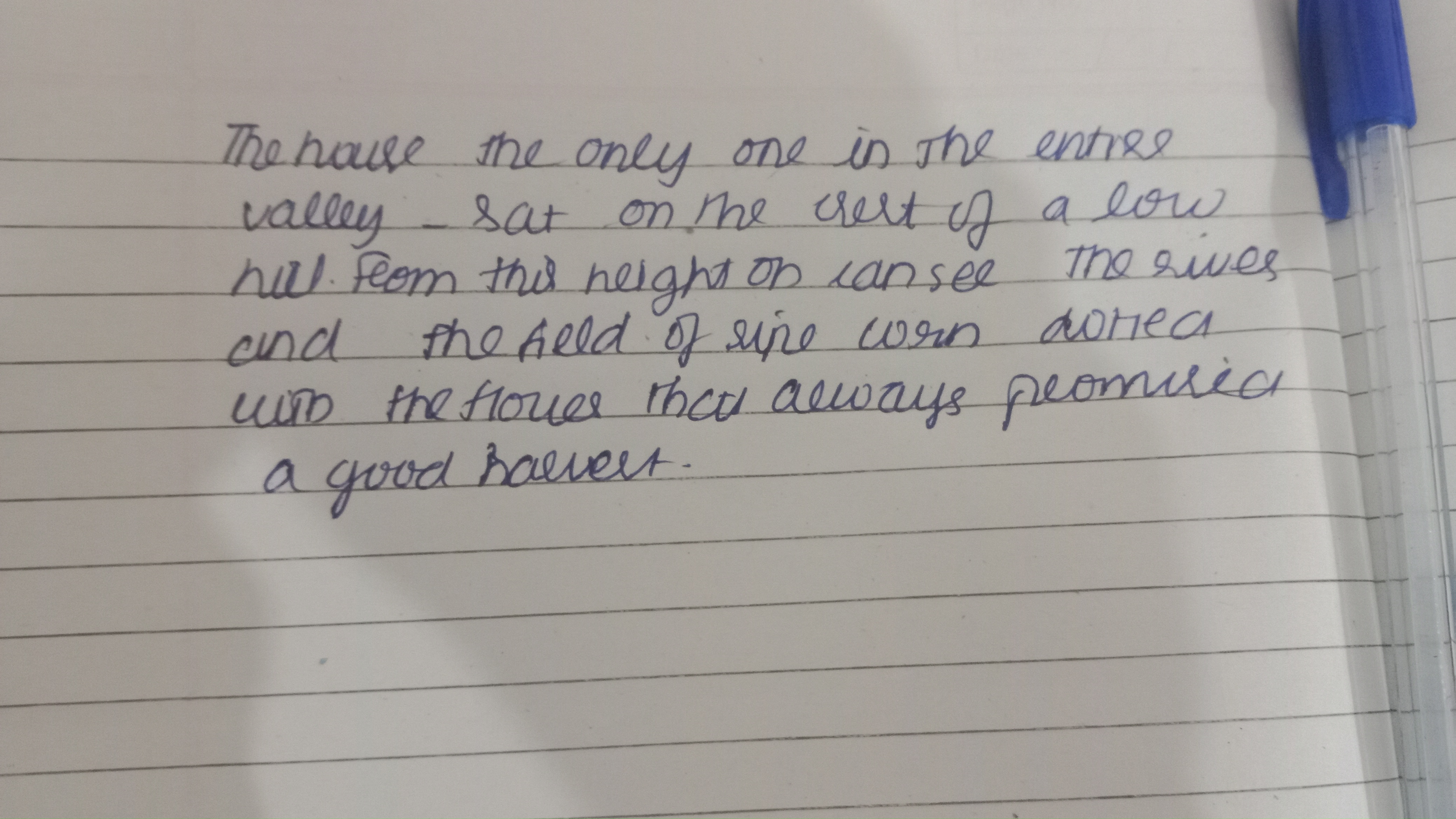 The handwriting presents a casual, cursive style, characterized by rounded letterforms and a slight rightward slant. The letter height is fairly consistent, though some letters, such as the 'h' in 'house' and 'height' extend slightly higher than others. The spacing between words is generally consistent, enhancing legibility, however, some words such as 'always' appear squashed. There's a notable lack of distinct letter connections in some instances, creating a slightly disjointed flow, for example, 'can see'.