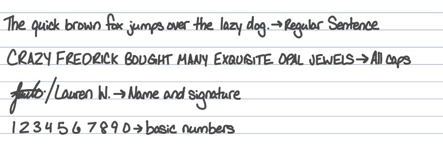 The handwriting style presents as a functional, clear, and slightly rounded script. In the 'Regular Sentence', the lowercase letters are generally uniform in size, suggesting a consistent approach. The capital letters in 'CRAZY FREDRICK' are bolder and larger, indicating emphasis and perhaps a desire to be noticed. The signature 'Lauren W.' shows a touch of flair with a slightly stylized form, a subtle departure from the otherwise practical handwriting.