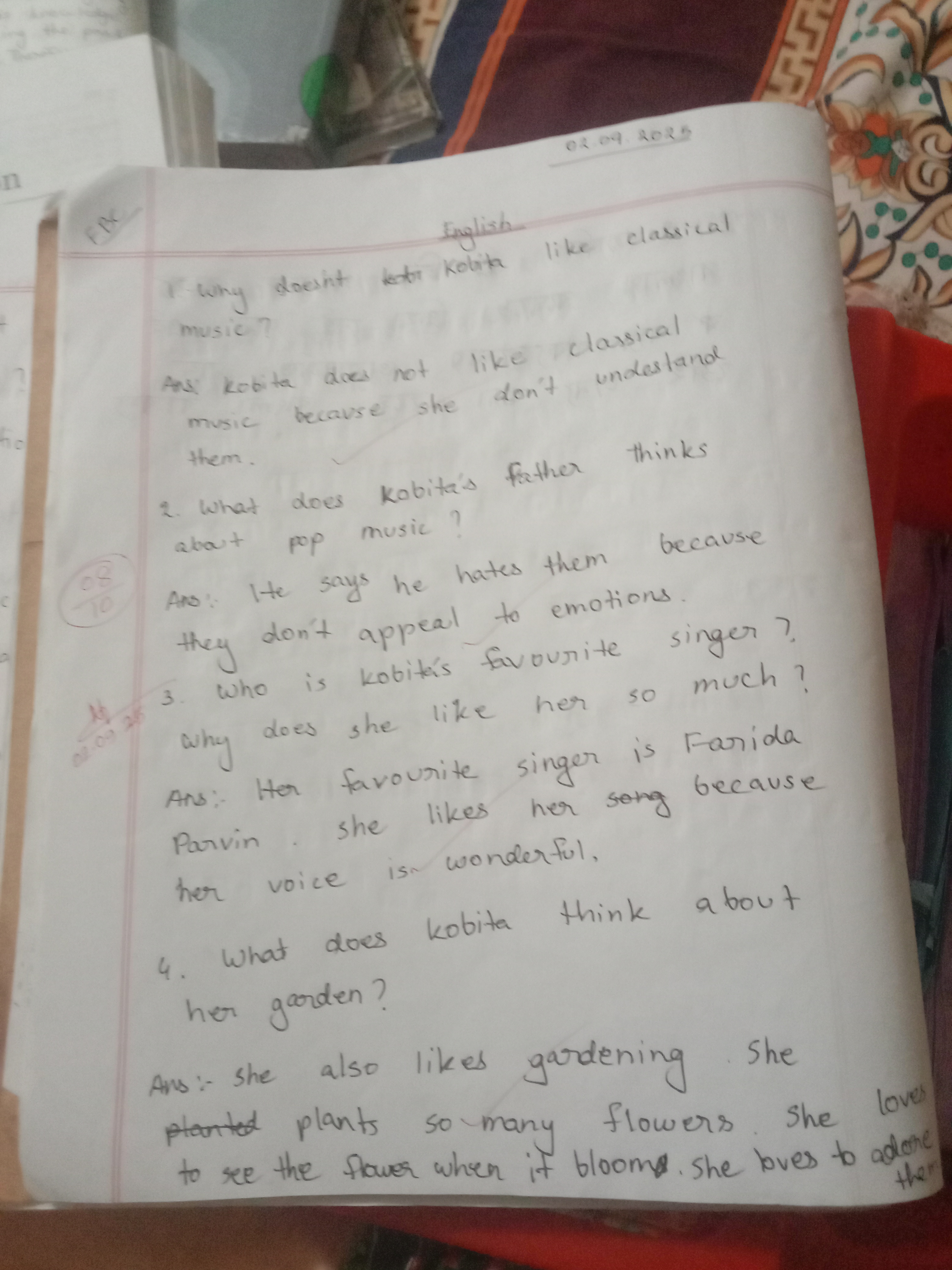 The handwriting has a gentle, rounded style. The letters are neatly formed but there is a slight variation in slant and size. For example, the 'k' in 'Kobita' has a consistent shape, but the size differs slightly between instances. The loops on letters like 'l' and 'f' are quite small, contributing to a compact feel. Overall, the handwriting appears neat and legible, though the pressure seems to vary, leading to inconsistencies in line thickness.