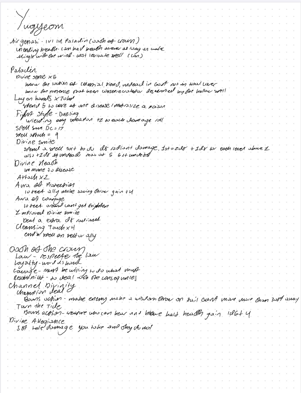 The handwriting is a mix of neat and hurried, leaning towards functional. It prioritizes legibility, with a slight forward slant and fairly consistent letter sizing. The letter formation is generally clear, though some connections between letters are simplified or omitted, creating a slightly detached appearance. Words like "Paladin" and "Divine" show a conscious effort to maintain neatness, while other phrases are written more quickly, sacrificing some precision. Overall, it's a practical handwriting style, suitable for note-taking and record-keeping.