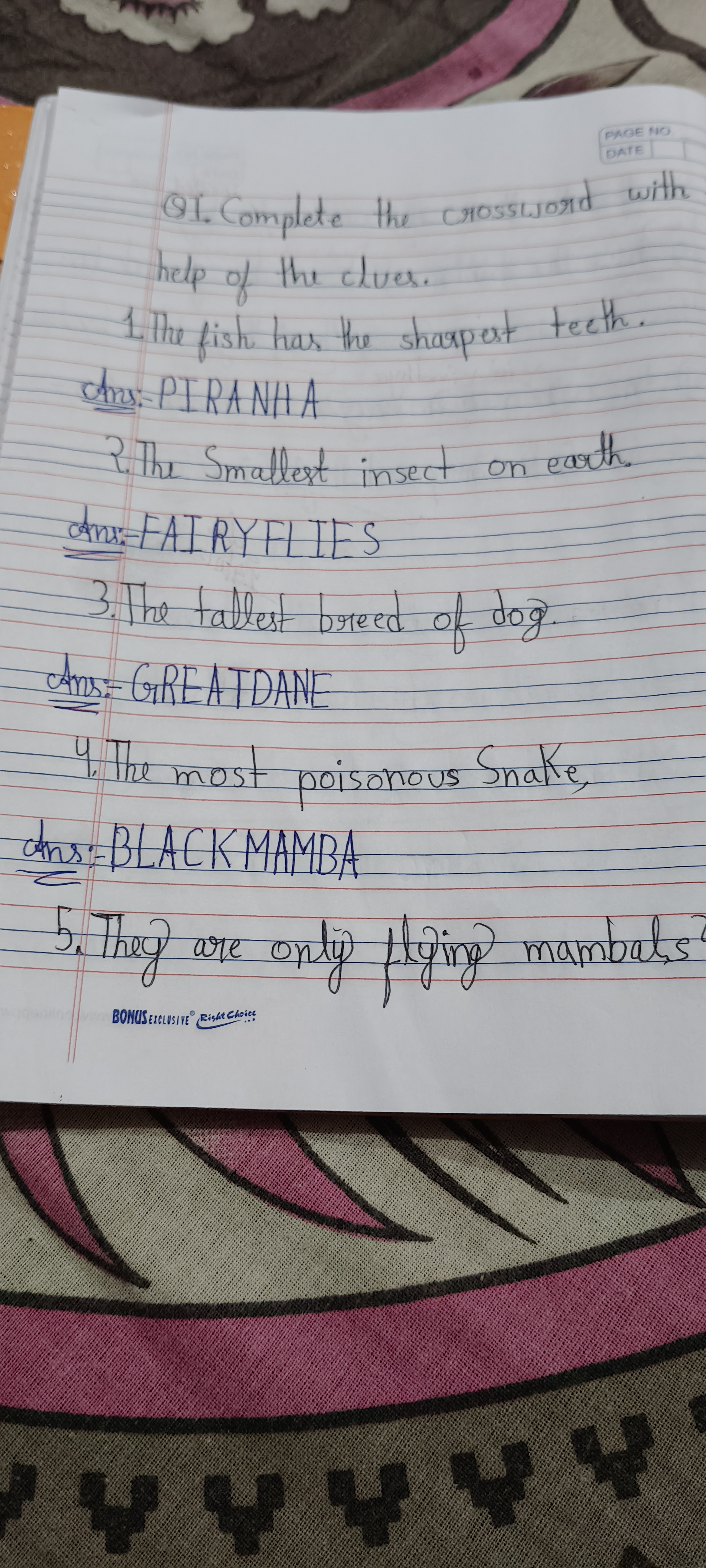 The handwriting is characterized by a careful, almost deliberate style, particularly noticeable in the neatly formed capital letters such as in "PIRANHA" and "GREATDANE". There is a mix of print and cursive, with a general slant to the right. The size is fairly consistent, and the letters are well-spaced, which enhances legibility. There is a clear distinction between the questions and answers, with the answers written in larger, bolder lettering and underlined for emphasis.