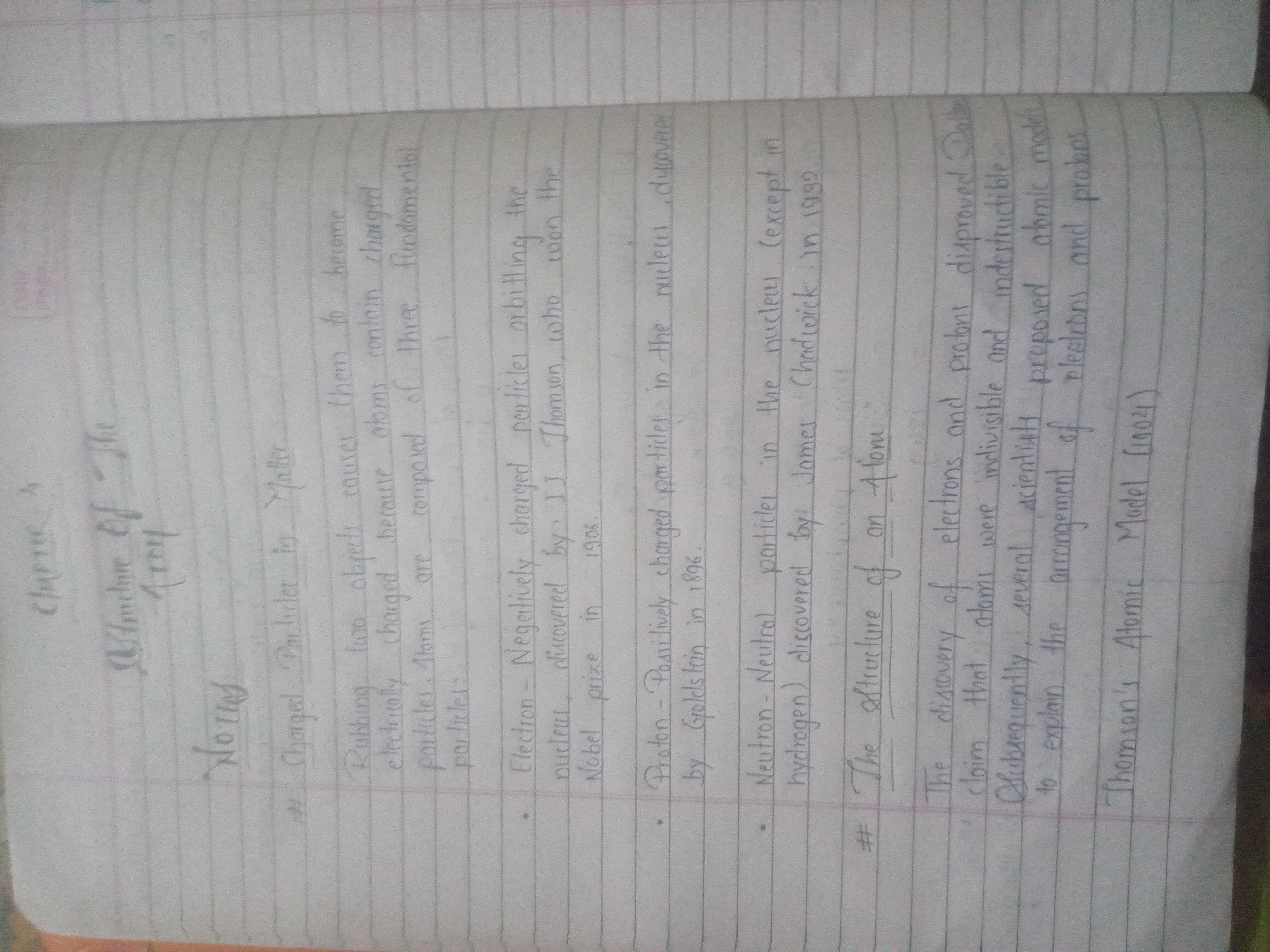 The handwriting exhibits a deliberate, upright style, characterized by evenly spaced letters and words. The script maintains a consistent slant, showing a measured and thoughtful approach. The size of the letters is uniform, contributing to the overall neatness. Words like "particles" and "Thomson" are carefully formed, with clear distinctions between the strokes.