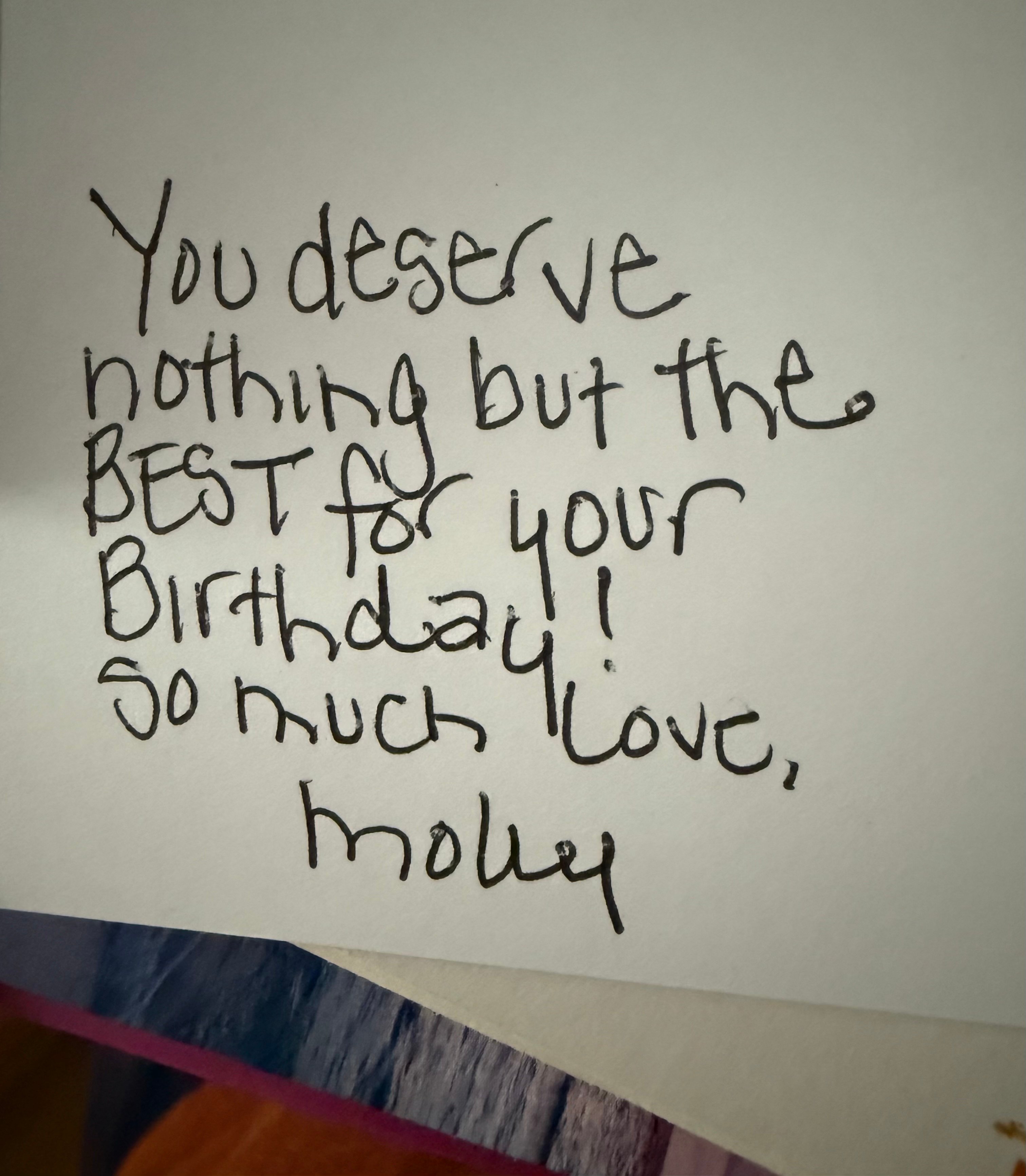 This handwriting presents a unique blend of enthusiasm and simplicity. The strokes are generally firm and upright, with a slight rightward slant, suggesting a forward-looking and engaged personality. The letter size is fairly large and the lines are quite bold, indicating a person who is not afraid to take up space and make an impression. The capital letters, like in "BEST" and "Birthday", are significantly larger than the lowercase, further emphasizing this tendency.