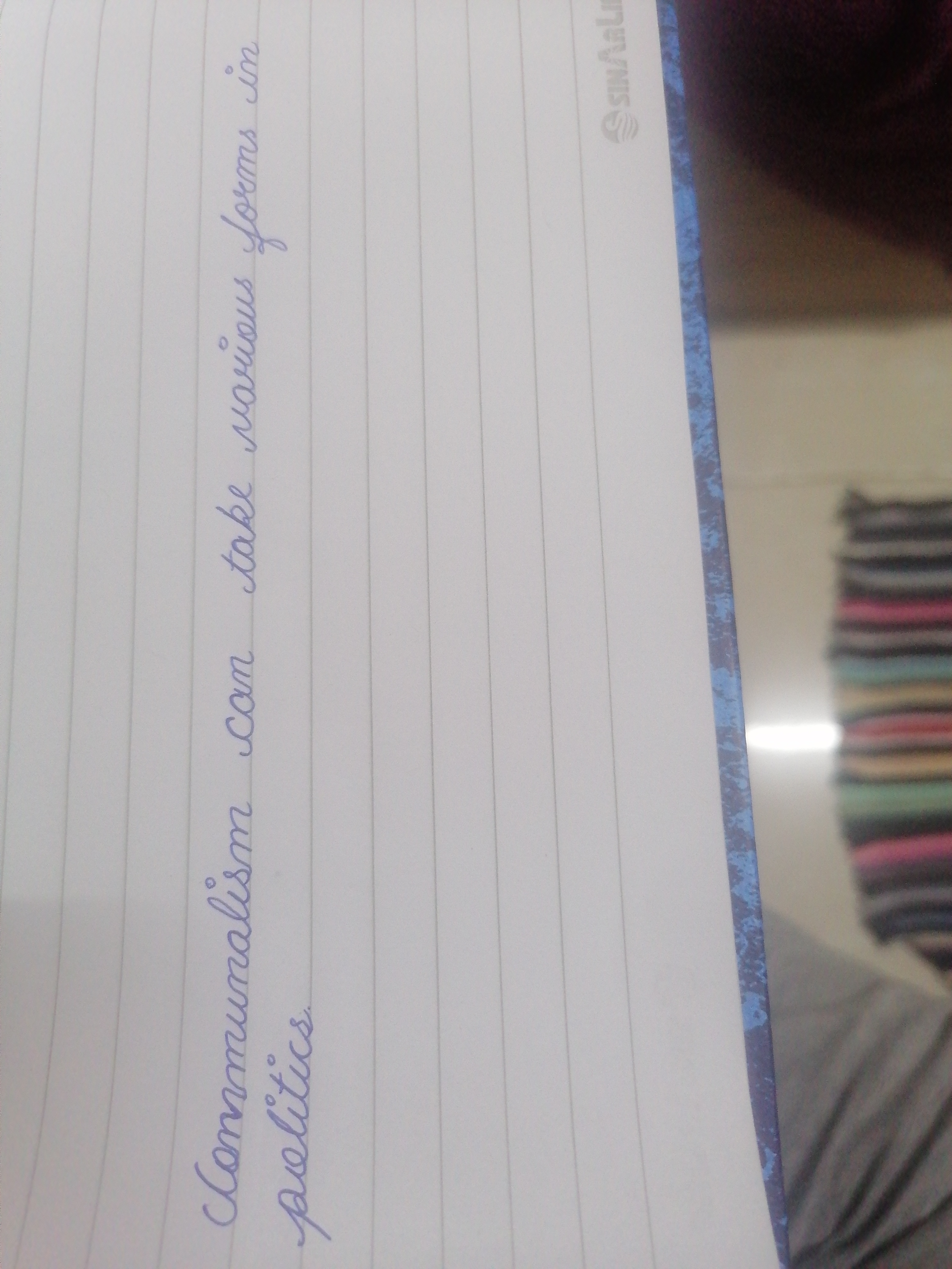 The handwriting sample displays a flowing, cursive style, with rounded letterforms evident in words like "Communalism", "can" and "politics". The connections between letters are smooth and consistent, suggesting a degree of fluency. The overall impression is one of neatness and legibility, though there is a slight lack of distinctiveness in the letter shapes. The writing is upright, and the size is fairly uniform throughout the sample.